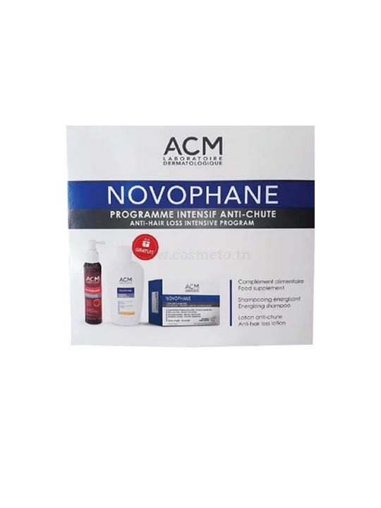 ACM NOVOPHANE COFFRET ANTI CHUTE Le coffret NOVOPHANE contient: 1 NOVOPHANE Complément Alimentaire 60 géllules. 1 NOVOPHANE LOTION Anti Chute 100ML 1 NOVOPHANE SHAMPOOING ÉNERGISANT 200ML GRATUI