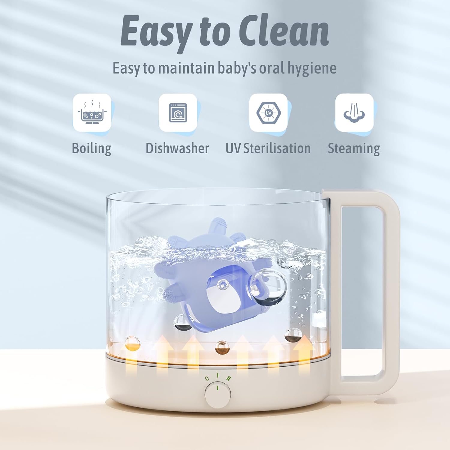 L’entretien de cet anneau de dentition est un jeu d’enfant. Résistant aux températures extrêmes, il peut être placé au réfrigérateur pour offrir un effet rafraîchissant apaisant ou stérilisé à l’eau bouillante pour une hygiène irréprochable. En un simple rinçage sous l’eau courante, il est prêt à être réutilisé, ce qui le rend aussi pratique que fiable.