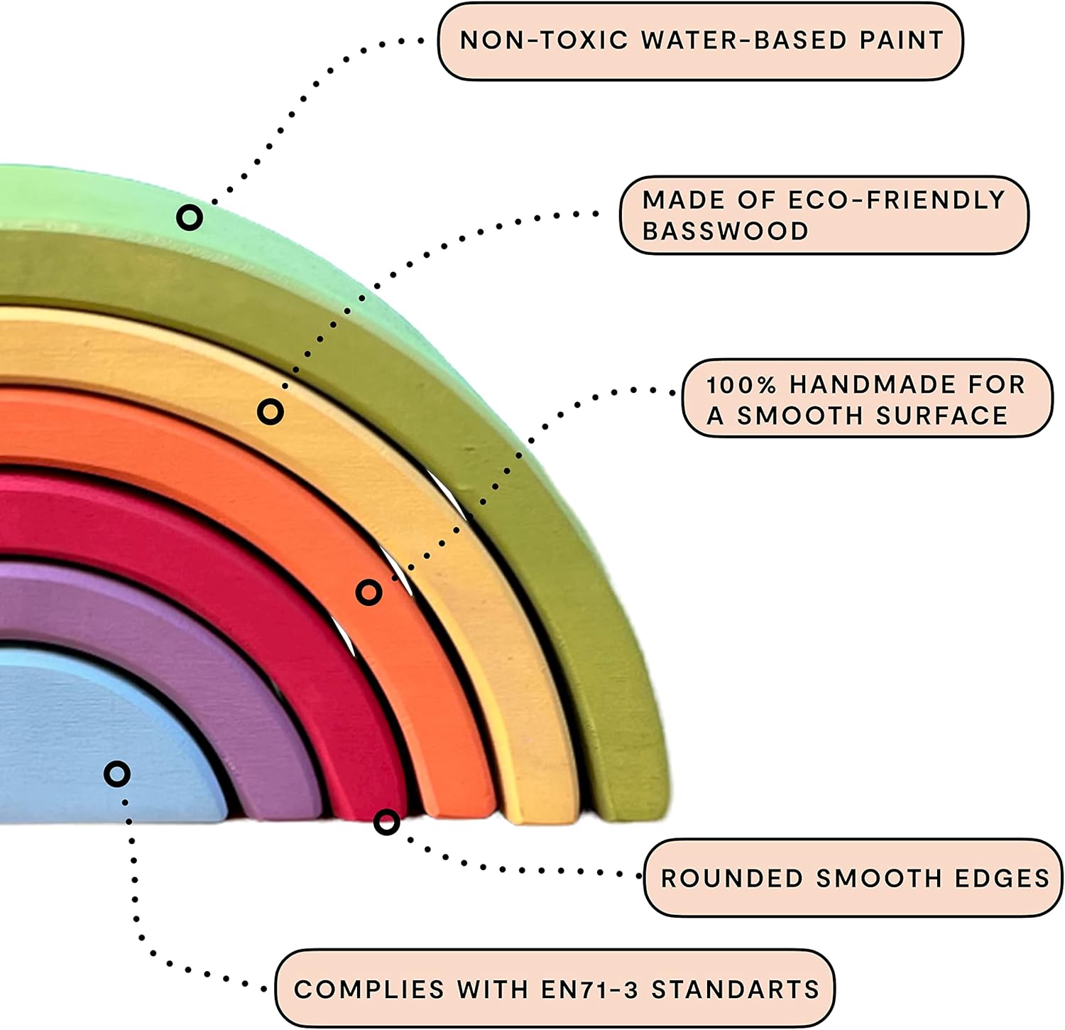 Conçu à partir de Basswood, un bois naturel reconnu pour sa robustesse et sa douceur au toucher, notre Arc-en-ciel Montessori garantit une utilisation durable. Chaque pièce est fabriquée à la main, assurant une finition lisse et sans aspérités. Pesant seulement 450 grammes, ce jouet en bois est à la fois léger et solide.