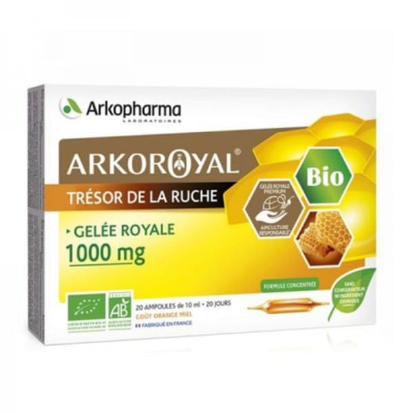 Arko Royal gelée royale bio 1000 mg trésor de la ruche est un complément alimentaire. Sa formule est concentrée et il est sans conservateur ni ingrédient chimique. PROPRIETES : La Gelée Royale est une substance sécrétée par les abeilles pour nourrir exclusivement l’une des leurs qui deviendra reine. Elle lui procurera une longévité de vie 40 fois supérieure et une intense productivité. ARKOROYAL a obtenu le 1er label d’apiculture responsable pour une qualité premium incluant : Une gelée royale naturelle, sans conservateurs, sans colorants et sans utilisation de pesticides chimiques. Une alimentation 100% naturelle des abeilles. Une maîtrise de la qualité de l’air, des sols, de l’eau autour des ruches, et des conditions de vie améliorées pour les apiculteurs locaux. 20 ampoules de 10 ml – 20 jours. Goût orange miel. Fabriqué en France.