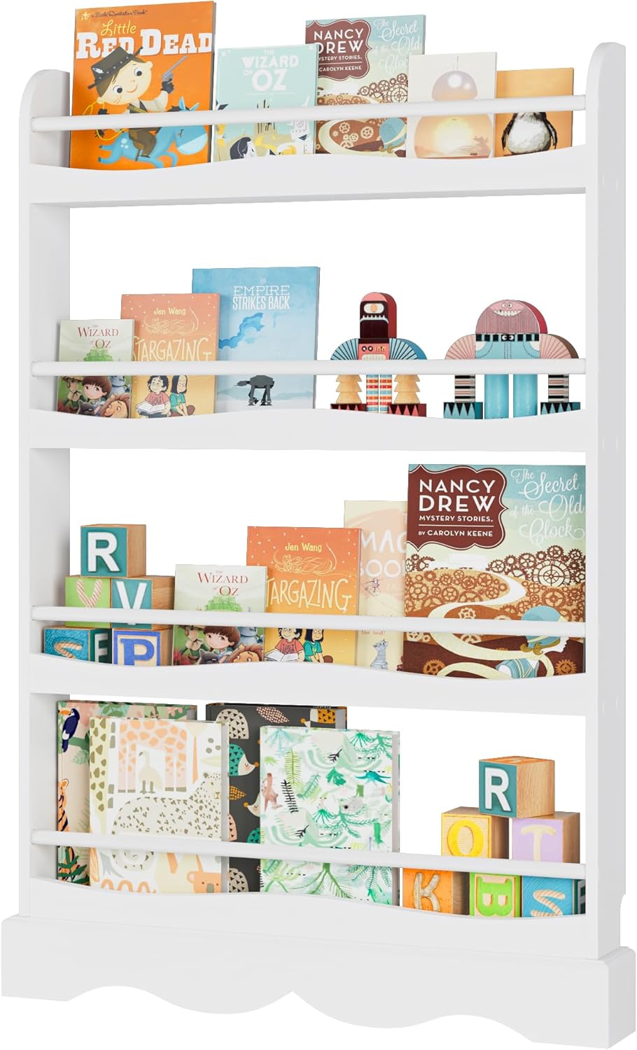 Cette bibliothèque Montessori propose quatre niveaux de rangement ouverts, idéaux pour les livres, les jouets, les poupées ou même les petites plantes en pot. Les bords ondulés et surélevés préviennent tout glissement, garantissant ainsi la sécurité des petits utilisateurs. De plus, son dispositif anti-dumping assure une stabilité inégalée, minimisant les risques d’accidents.