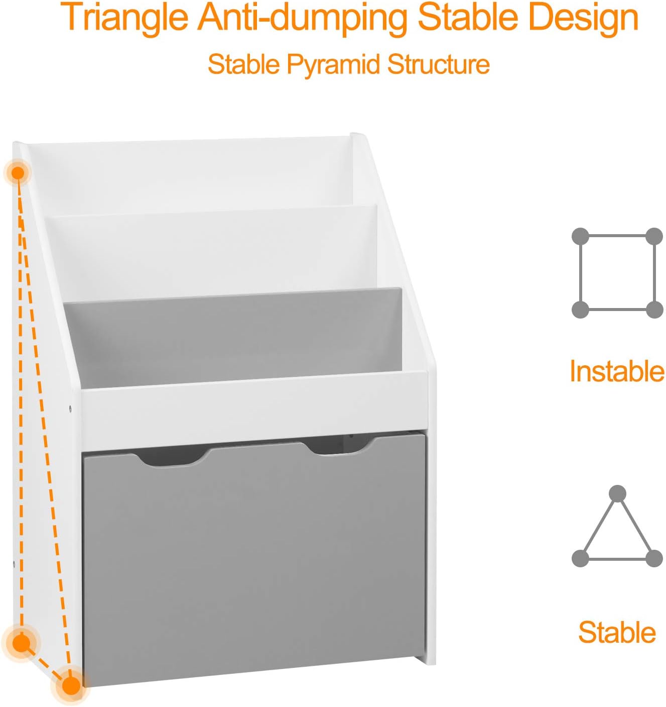 Grâce à sa conception trapézoïdale, la partie inférieure de la bibliothèque est plus large que la partie supérieure, assurant ainsi une stabilité optimale. Vous n’aurez plus à vous inquiéter que votre enfant renverse la bibliothèque par accident.