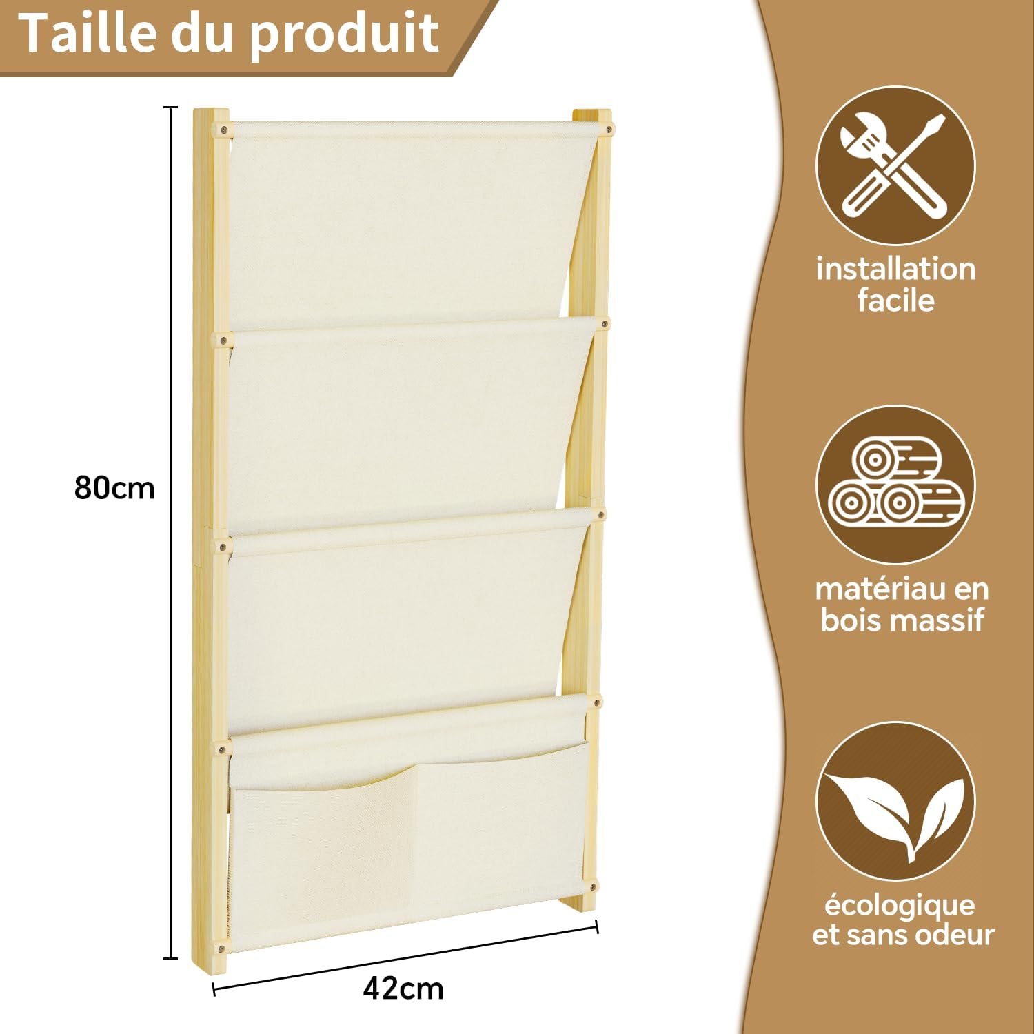 - Quatre niveaux en tissu pour s’adapter à tous les formats de livres.