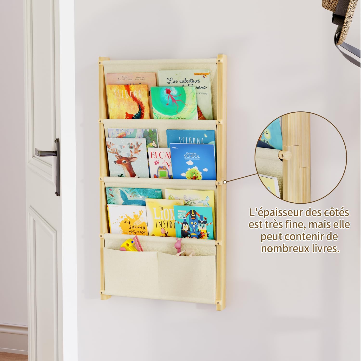 Ses quatre niveaux en tissu durable permettent de ranger des livres de toutes tailles, qu’il s’agisse de contes illustrés, de cahiers ou d’albums. Le tissu s’adapte à l’épaisseur des ouvrages, garantissant une organisation impeccable tout en restant accessible pour les enfants. Cette solution innovante marie praticité et design épuré.