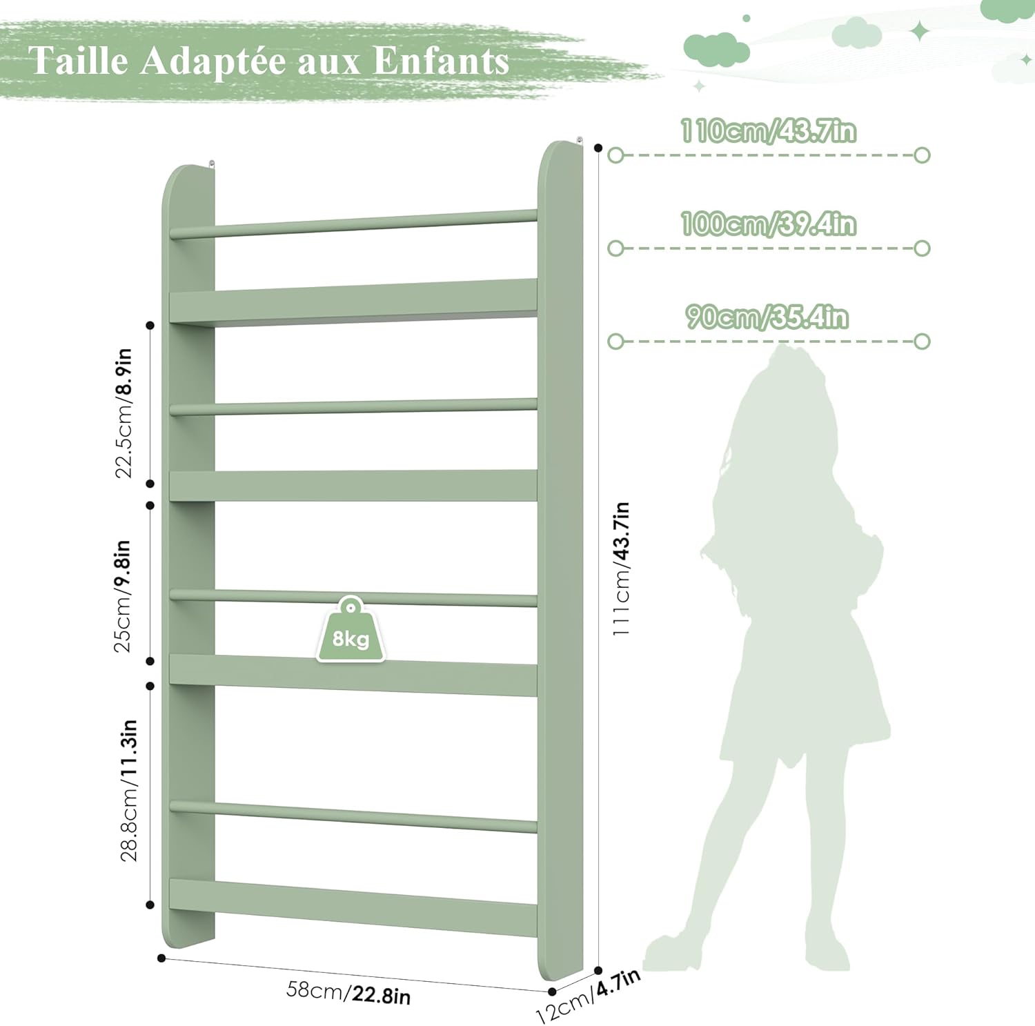 Bibliothèque murale montessori pour enfant avec étagères vertes