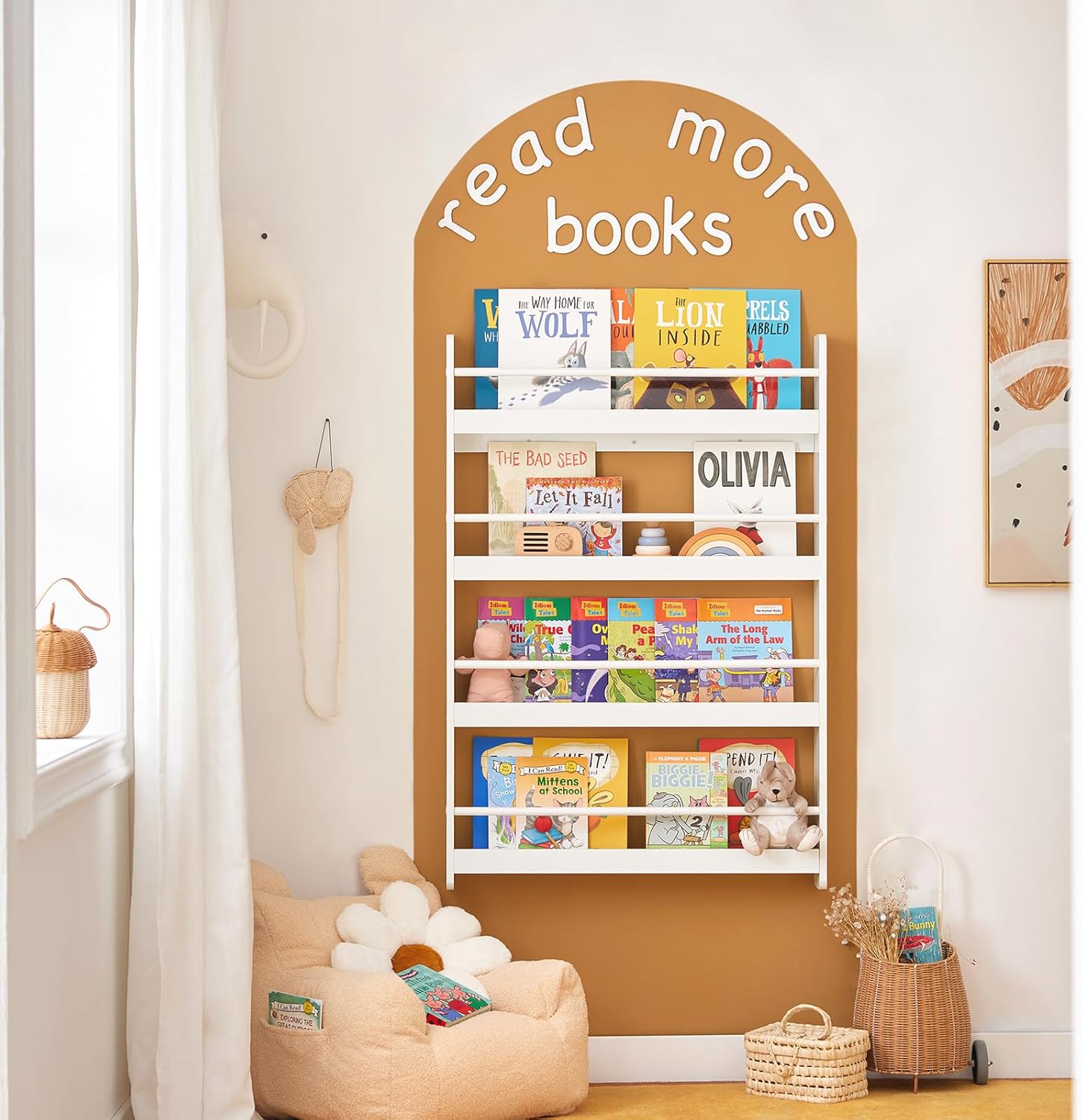 Cette bibliothèque murale est dotée de quatre niveaux permettant d’accueillir une grande quantité de livres. Elle offre un gain d’espace considérable tout en étant fonctionnelle. Les enfants peuvent facilement ranger leurs livres et jouets grâce à sa hauteur adaptée. Sa capacité de charge maximale est de 24kg, assurant ainsi une grande durabilité.