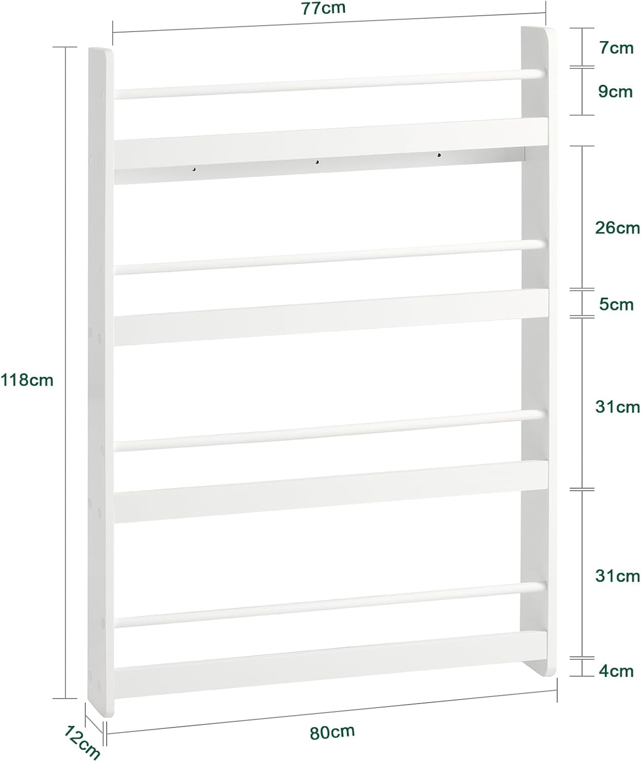 Fabriquée en bois MDF de classe E1, cette bibliothèque est non seulement solide mais aussi respectueuse de l’environnement grâce à son éco-peinture. Sa couleur blanche s’intègre facilement dans tous les styles de décoration. Ses dimensions sont de 80cm en longueur, 12cm en profondeur et 118cm en hauteur. Chaque étagère mesure 77cm de long, 10,5cm de profondeur et 29cm de hauteur.