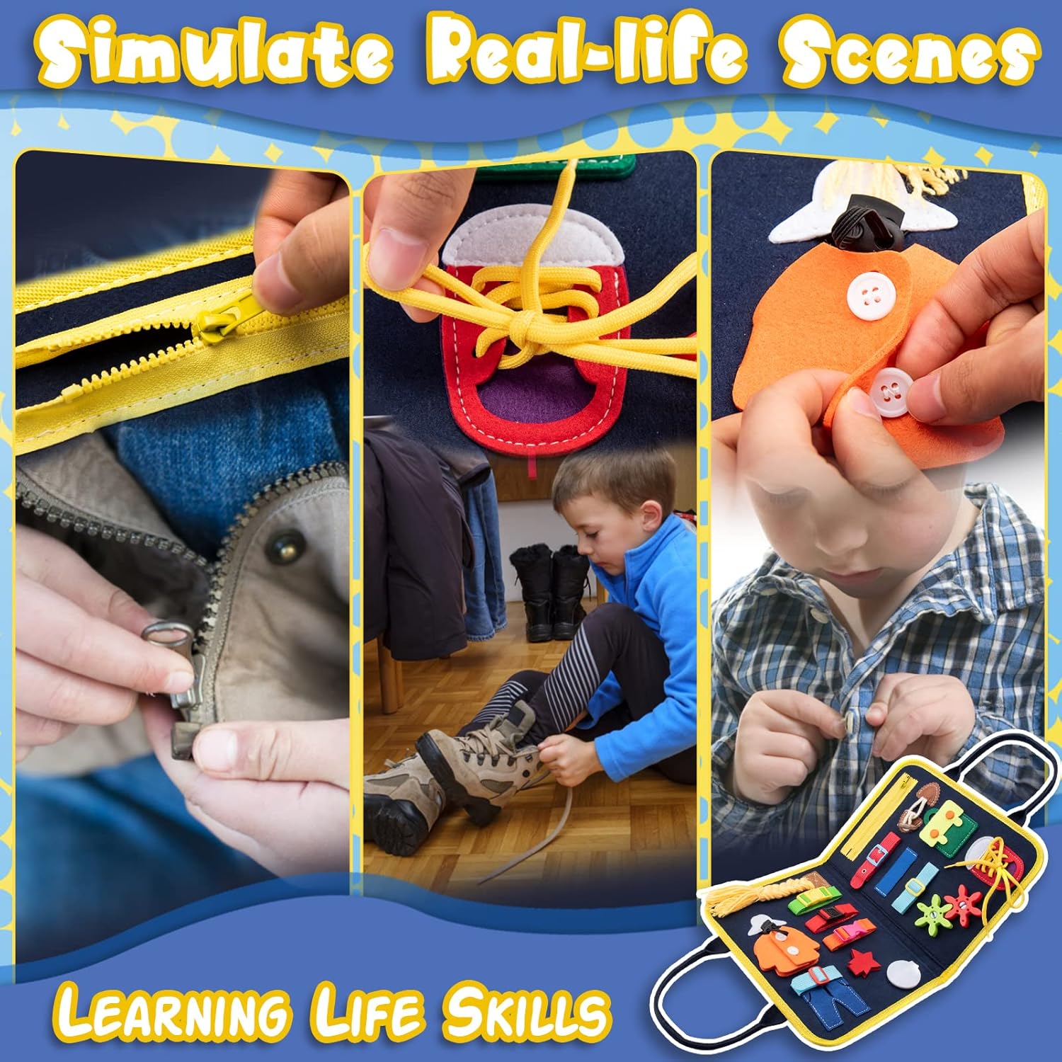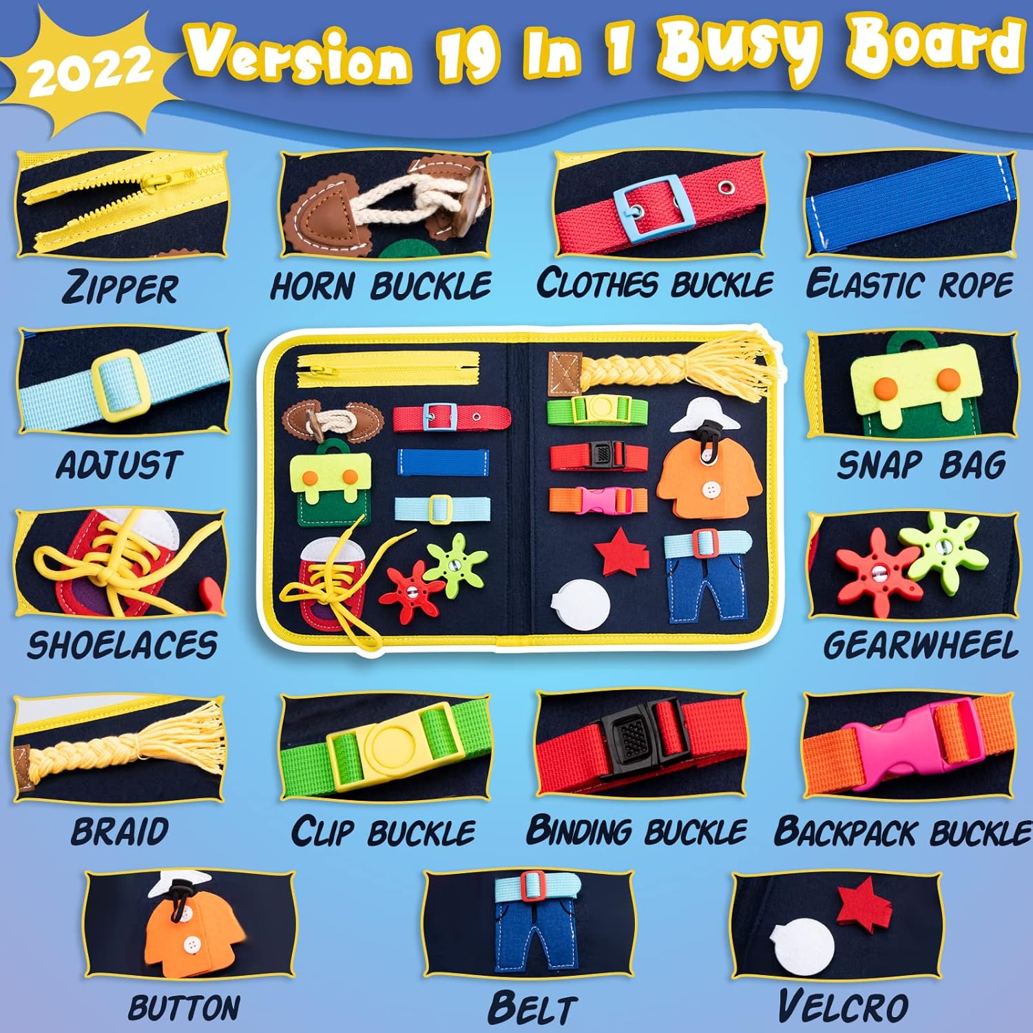 Imaginez un outil éducatif qui offre à votre enfant une variété de 19 activités stimulantes et amusantes. La Busy Board Montessori est conçue pour aider votre enfant à développer ses compétences d’auto-habillage tout en profitant d’un plaisir sensoriel incomparable. De l’utilisation des fermetures éclair, en passant par les boucles, les roues dentées, les boutons, les lacets et les tresses, chaque activité a été pensée pour enrichir l’expérience d’apprentissage de votre enfant.
