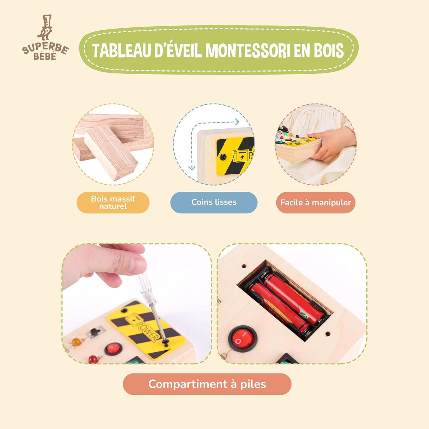 Découvrez le Busy Board Montessori en Bois, un jouet éducatif sensoriel parfaitement adapté aux enfants de 3 ans. Ce jeu offre une stimulation sensorielle variée, essentielle au développement cognitif des tout-petits. Fabriqué en bois de haute qualité, il dispose de bords lisses et de composants non toxiques pour assurer une utilisation sûre et sereine.