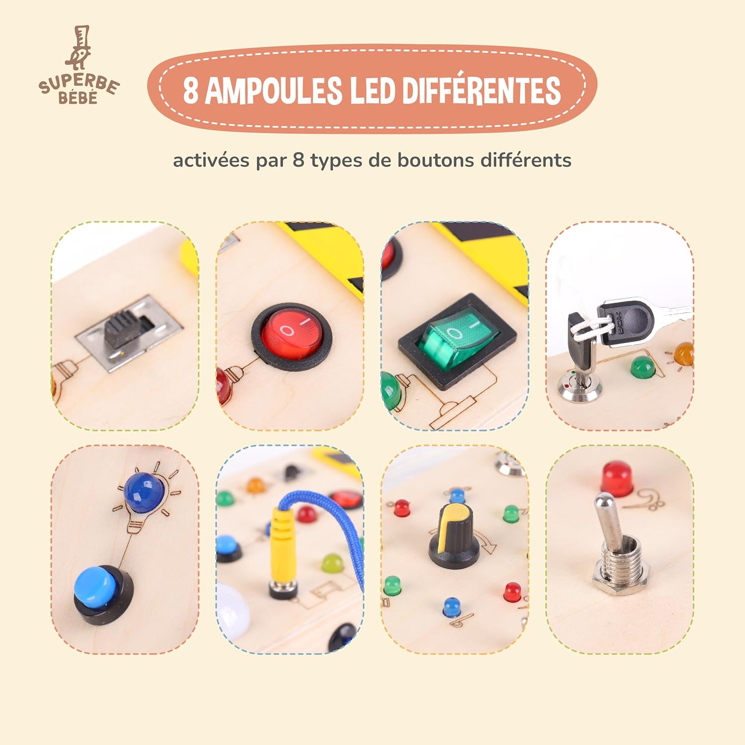 Ce Busy Board n’est pas qu’un simple jeu éducatif, c’est aussi un jouet interactif et ludique. Il intègre un interrupteur lumineux LED pour rendre l’expérience de jeu encore plus amusante. Votre enfant sera captivé par les différentes activités qu’offre cette planche d’activité.