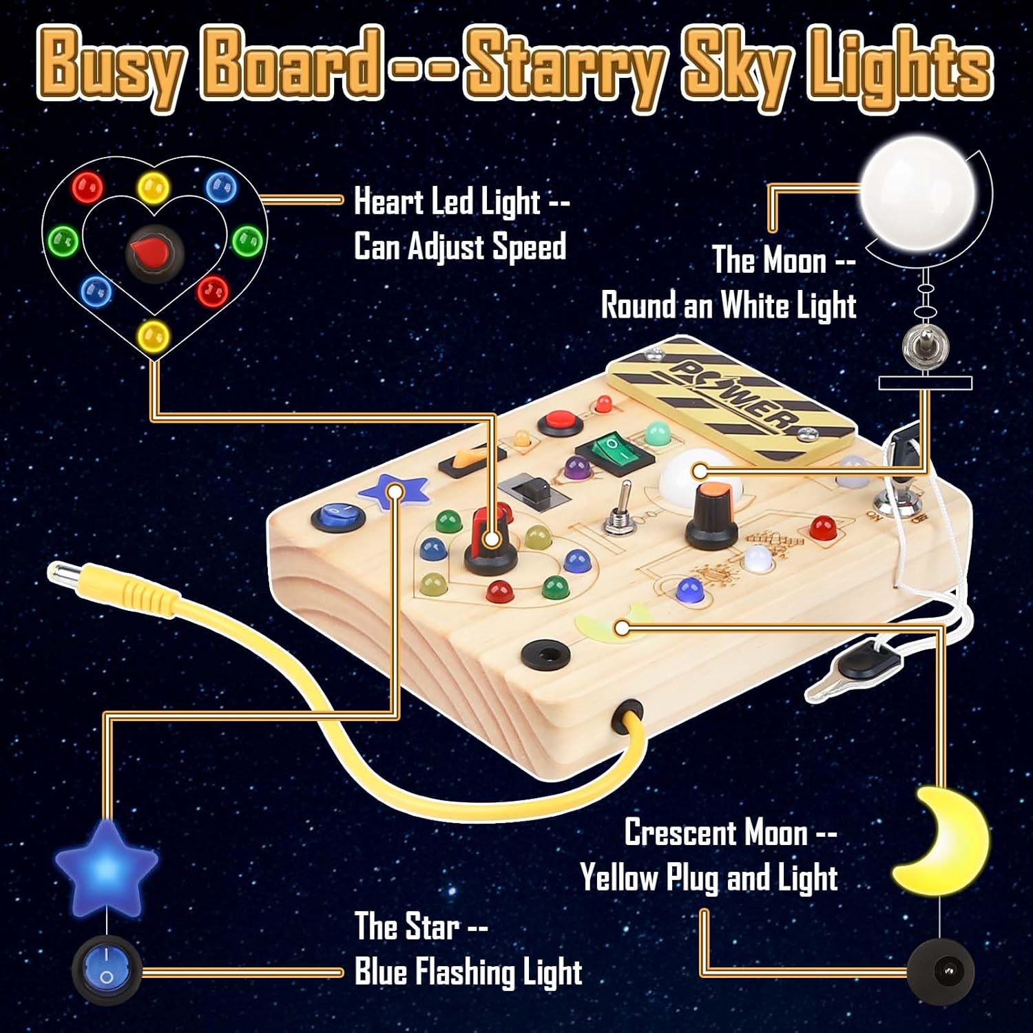 Le busy board Montessori se distingue par son intégration harmonieuse d’éléments d’étoiles et de lune. La lumière LED à vitesse variable utilise un design en forme de cœur de pêche, apportant une touche ludique et enfantine. Les lumières scintillantes des étoiles sont irrésistibles pour les enfants, attirant leur curiosité et captivant leur attention.