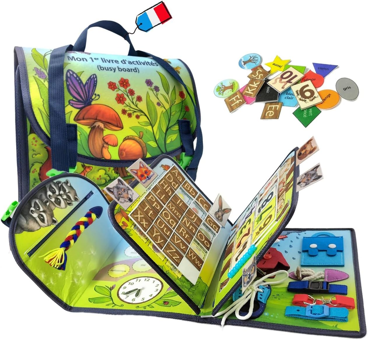 D’une dimension de 25 x 29 x 4 cm et pesant seulement 440 grammes, ce busy board se présente sous la forme d’un cartable pratique. Ses nombreuses activités thématiques encouragent le développement de la motricité fine et aident à l’apprentissage de notions essentielles comme l’alphabet, les chiffres, les couleurs, les formes et même les saisons.