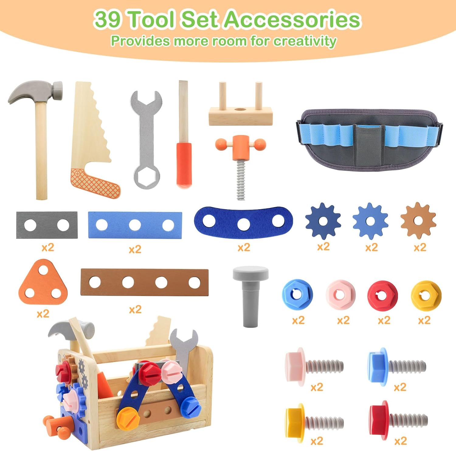 La caisse à outils Montessori est un condensé de 39 outils en bois, minutieusement sélectionnés pour offrir une expérience d’apprentissage complète et immersive. Au programme : un établi robuste, une ceinture à outils pratique, des marteaux, des tournevis, une scie à bois, des clés à molette et bien plus encore. Chaque élément est conçu avec des formes variées et des couleurs vives pour rendre l’expérience aussi amusante qu’éducative.