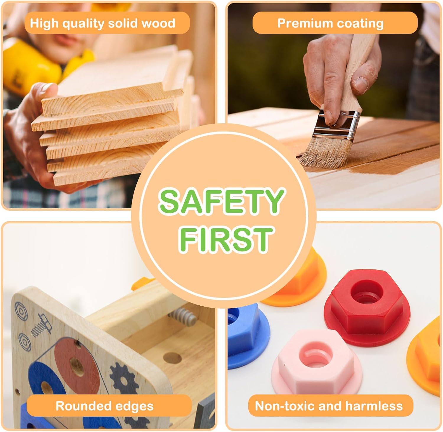 Le souci du détail ne s’arrête pas là. La mallette à outils en bois est fabriquée en bois massif non toxique de haute qualité, garantissant sécurité et durabilité. Les bords sont lisses et arrondis, et la surface est sans bavure pour éviter tout risque d’échardes.