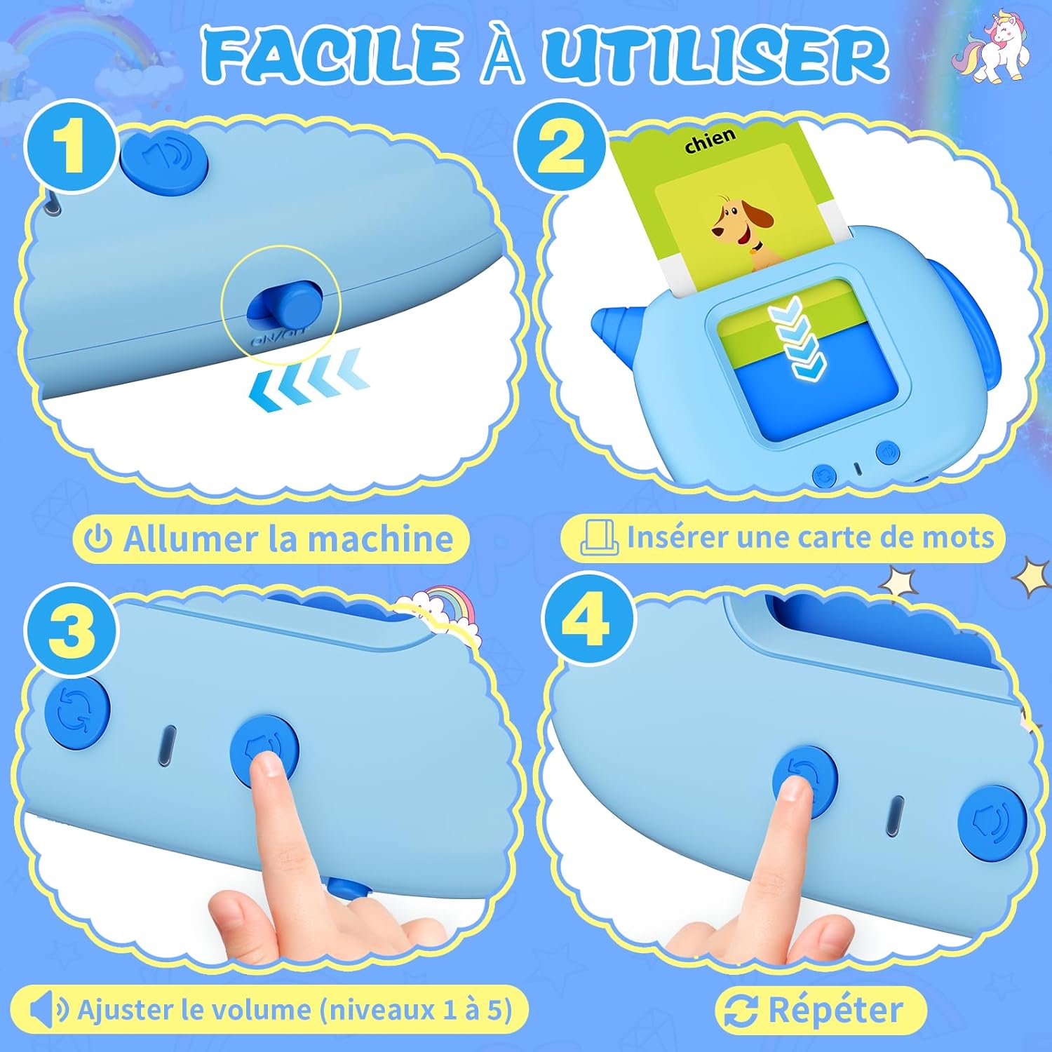 Grâce à ses effets sonores amusants, cette carte flash parlante capte l’attention des enfants et stimule leur concentration. Elle favorise une meilleure mémorisation des mots et renforce leur impression auditive. L’apprentissage devient ainsi un jeu captivant qui sollicite l’ouïe et la vue de votre enfant tout en développant sa capacité cognitive.