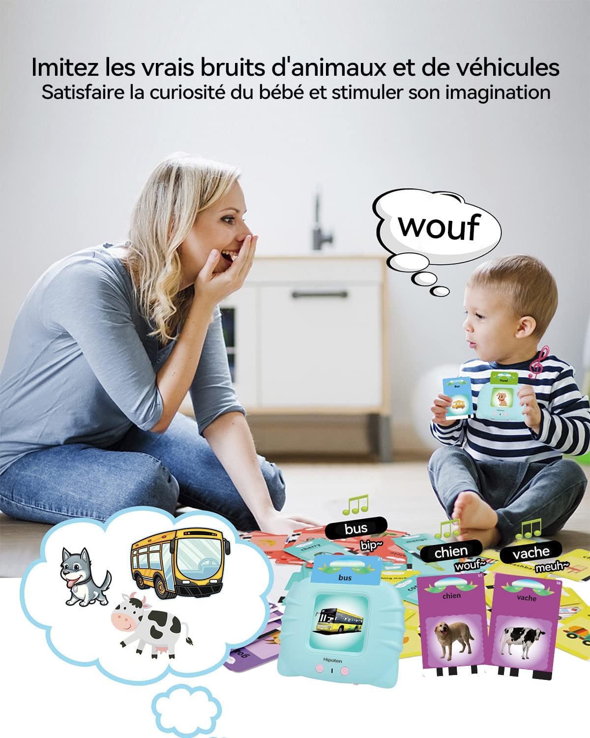 Avec pas moins de 112 flashcards recto-verso, soit un total de 224 mots à découvrir, ces cartes éducatives couvrent une large palette de thèmes : animaux, véhicules, nourriture, fruits, couleurs, légumes, besoins quotidiens, costumes, nature, personnes, métiers et formes. Chaque carte est accompagnée d’illustrations colorées et de sons amusants, rendant l’apprentissage encore plus captivant.
