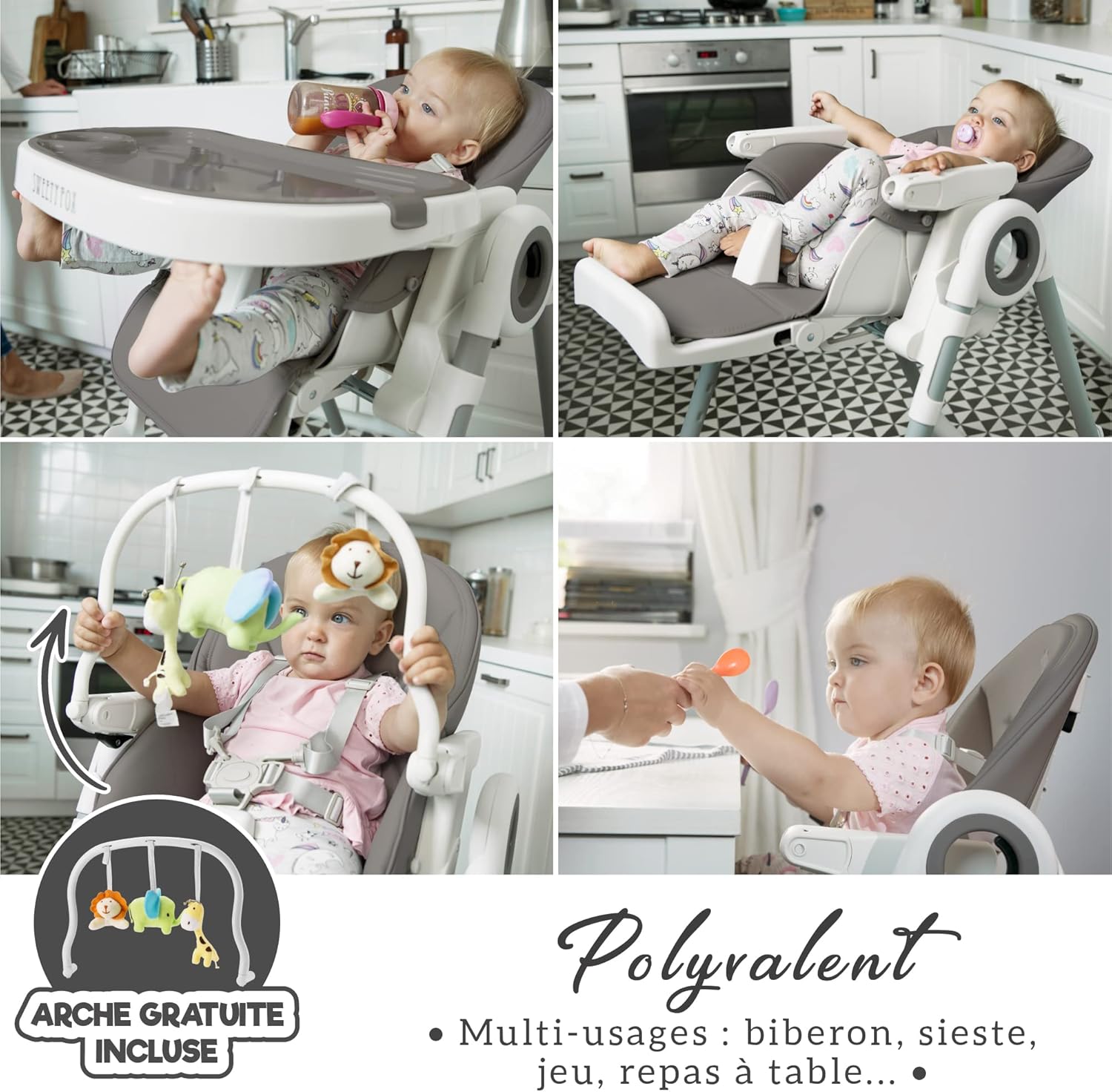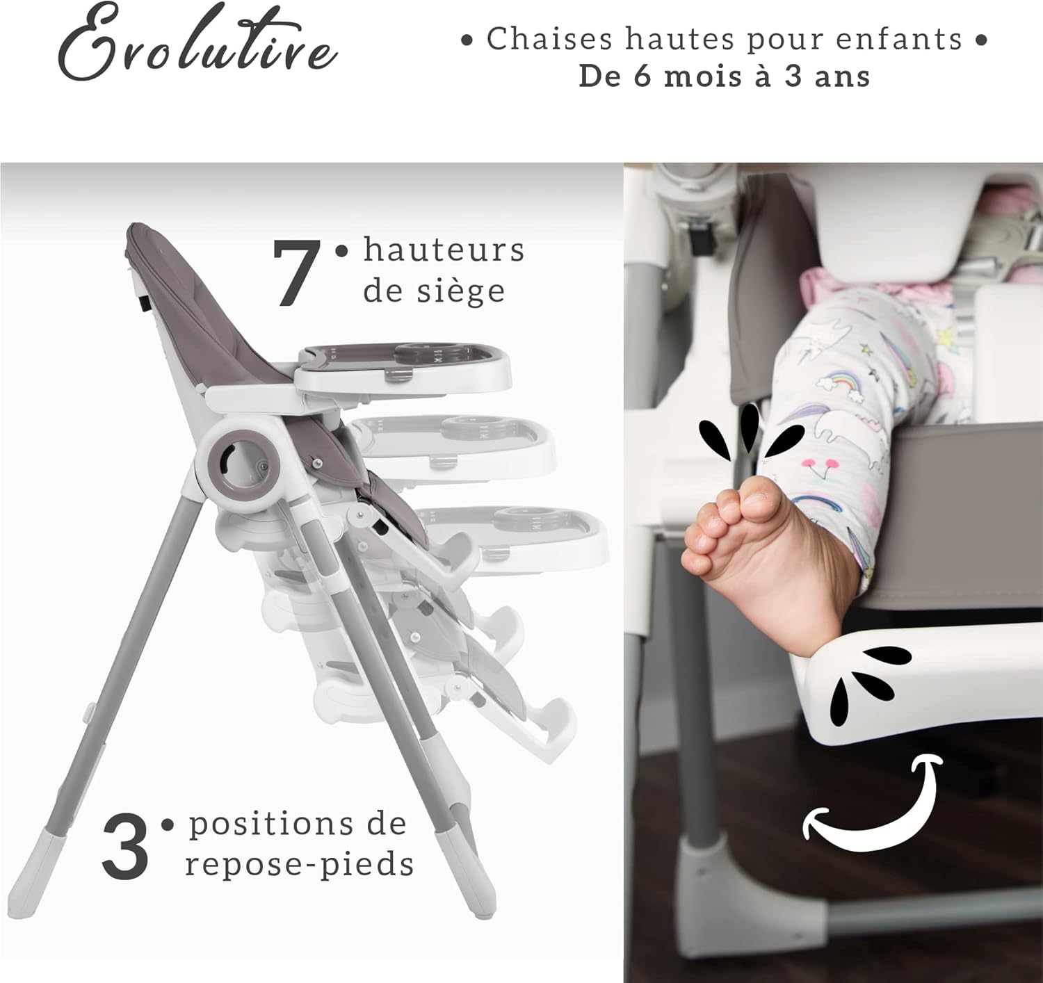 Découvrez la Chaise Haute Bébé Évolutive Sweety Fox Grise, conçue dans l’esprit de la pédagogie Montessori. Ce produit haut de gamme se distingue par sa polyvalence et sa capacité à évoluer avec votre enfant. Elle est dotée de 7 hauteurs différentes, 3 positions pour le repose-pieds et 5 positions pour le dossier inclinable.