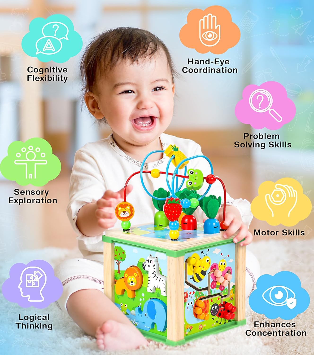 Équipé de sept jeux en un, ce cube d’activité est un véritable trésor ludique qui accompagnera votre enfant dans son développement. Chaque face propose une nouvelle aventure : un labyrinthe de perles pour développer la dextérité, un parcours d’insectes pour aiguiser la coordination œil-main, un jeu de correspondance d’animaux pour favoriser la reconnaissance des formes, et bien plus encore.