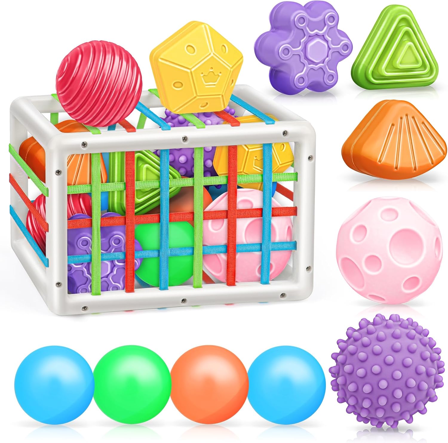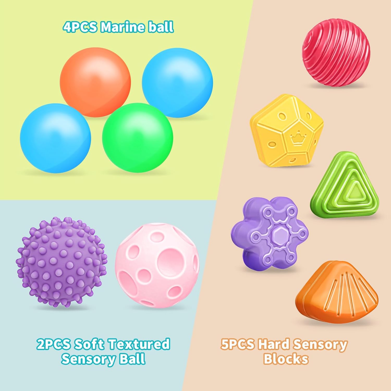 Chaque élément a été conçu pour développer une compétence spécifique chez l’enfant. Par exemple, les blocs durs aux formes variées favorisent la reconnaissance des formes et développent la motricité fine. Les balles sensorielles douces sollicitent le toucher, sens primordial dans l’apprentissage du monde qui entoure l’enfant. La boîte sensorielle rectangulaire avec ses bandes élastiques colorées offre une exploration tactile enrichissante.