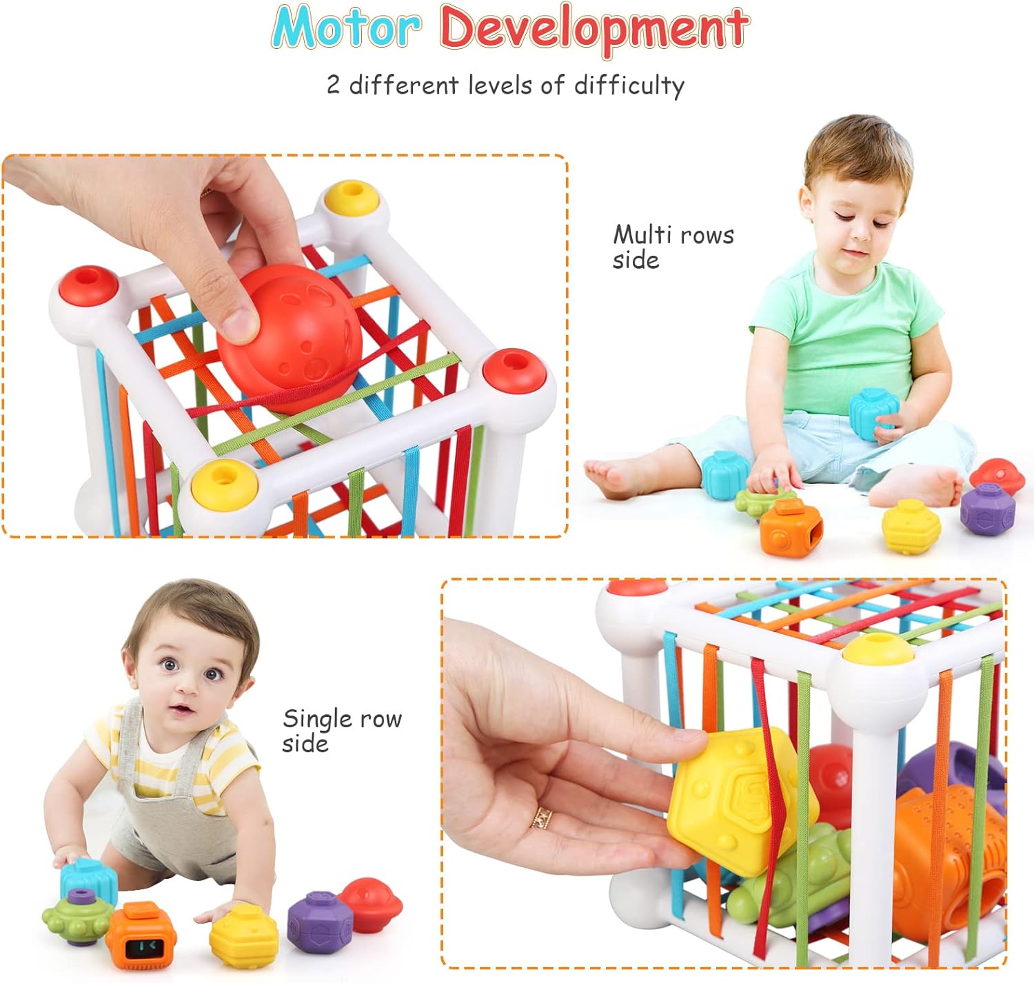 - Les bandes élastiques offrent une tension suffisante pour que l’enfant puisse insérer et retirer les blocs de construction du cube.