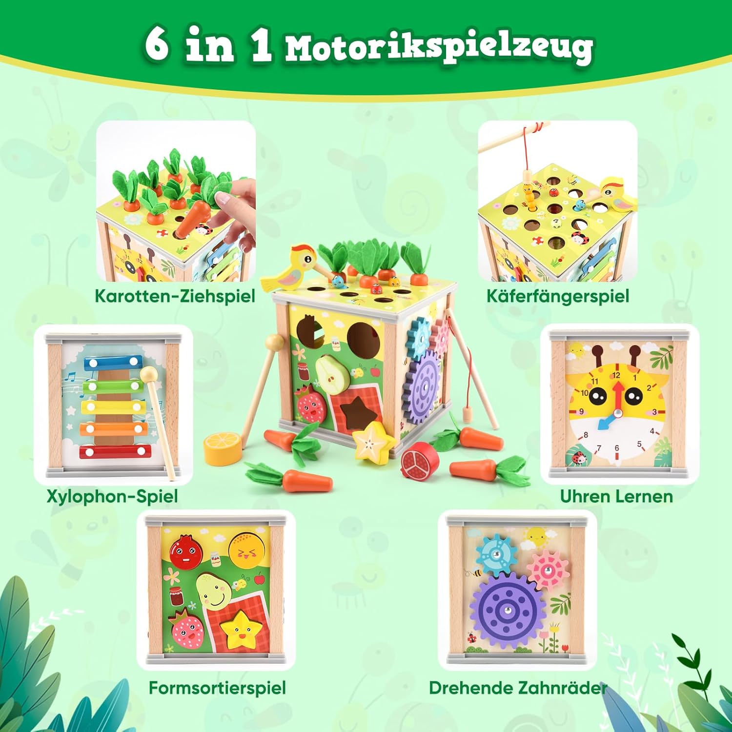 Le cube est équipé de 5 faces de jeu différentes, chacune proposant une activité distincte. Que ce soit la récolte de carottes, la capture d’insectes, le xylophone pour bébé, l’horloge d’apprentissage, les engrenages rotatifs ou les formes assorties, chaque jeu a été pensé pour éveiller la curiosité des enfants et stimuler leur créativité. Les couleurs vives attirent l’attention des petits et les aident à développer leur capacité de reconnaissance des couleurs.