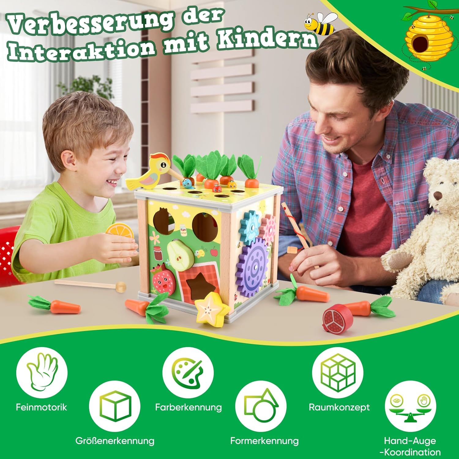 Le dessus du cube est amovible, permettant un rangement pratique des pièces dans le cadre de la boîte. Cela peut également servir de boîte de rangement pour d’autres petits jouets. En outre, ce jouet en bois favorise l’interaction parent-enfant, renforçant ainsi le lien affectif entre vous et votre tout-petit.