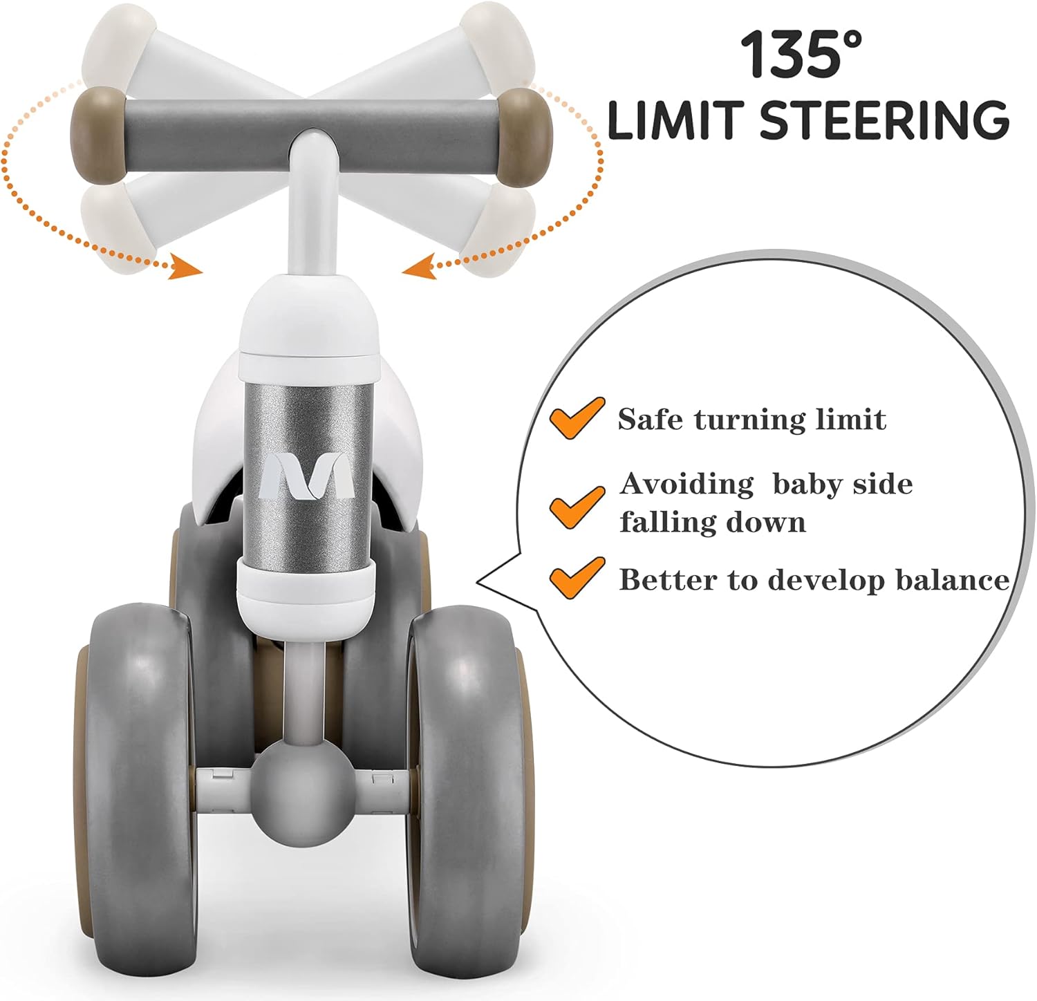 Conçue pour offrir une expérience d’apprentissage sécurisée, cette draisienne est idéale pour les enfants de 1 à 3 ans. Avec son design sans pédale, ses roues pleines et élargies, et sa direction limitée à 135°, elle garantit une stabilité optimale et protège les pieds des plus petits. Ces caractéristiques ingénieuses réduisent les risques de chute et permettent à votre enfant de s’amuser en toute sérénité.