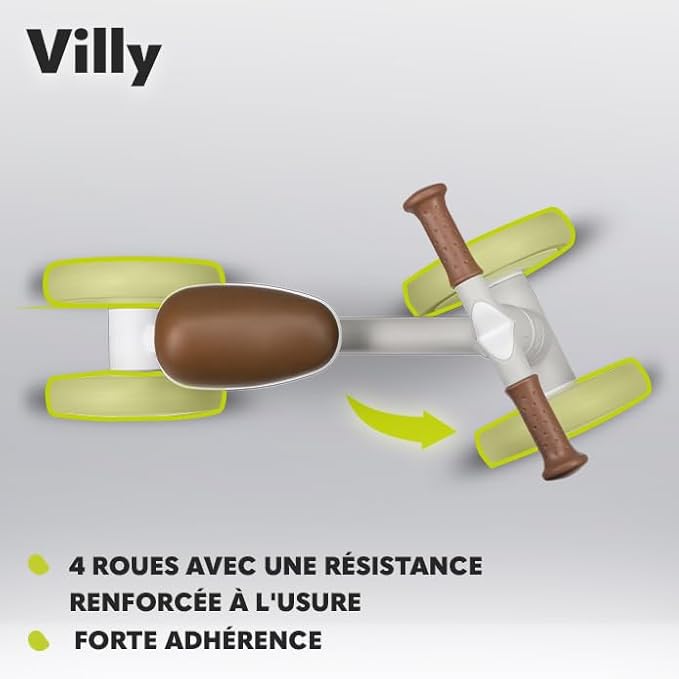 Les roues de cette draisienne sont fabriquées en mousse EVA de haute qualité, associée à une matière plastique TPR robuste. Cette combinaison garantit une excellente adhérence sur différentes surfaces, qu’il s’agisse de carrelage, de parquet ou d’un sol extérieur. De plus, ces roues sont silencieuses et ne laissent aucune trace, ce qui les rend parfaites pour une utilisation aussi bien en intérieur qu’en extérieur.