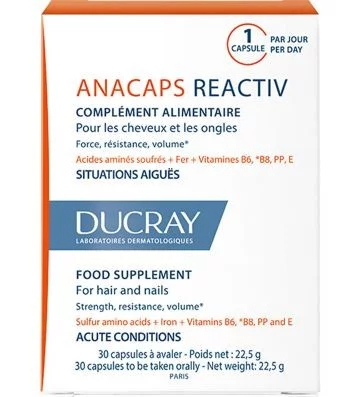 DUCRAY ANACAPS Reactiv. Anacaps Reactiv de Ducray est un complément alimentaire qui participe au rétablissement du cycle pilaire après un événement aigu qui l’a endommagé.