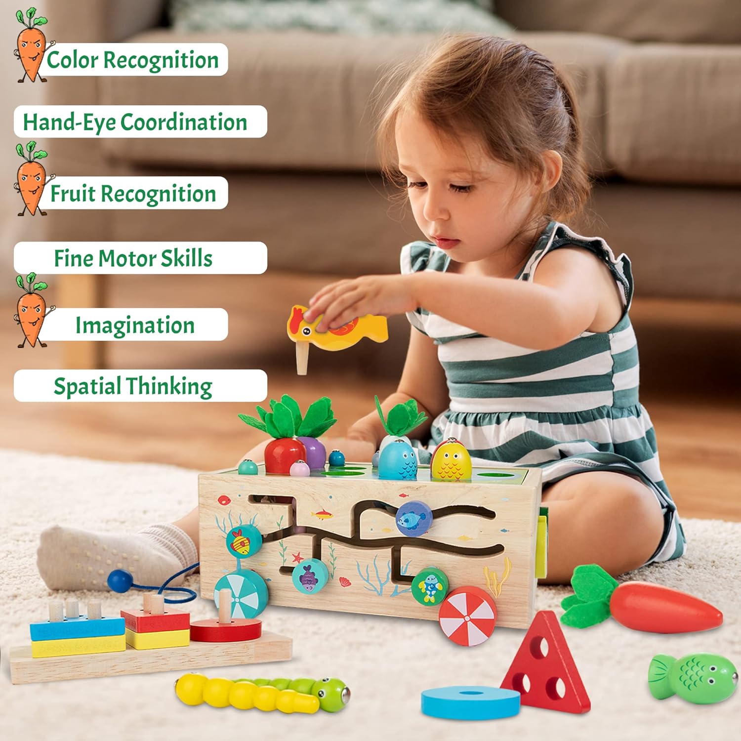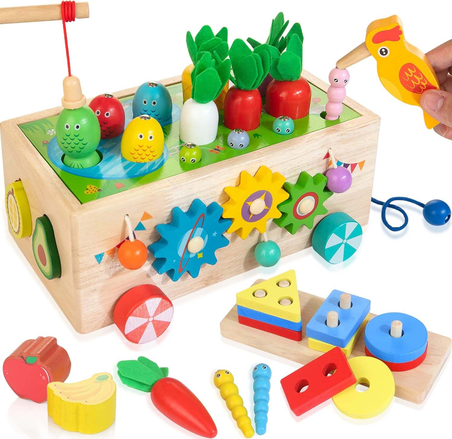 Cet ensemble regroupe huit jeux différents, chacun offrant un univers d’apprentissage unique. De la pêche dans l’étang à la récolte des ananas et des carottes, en passant par le tri et l’empilement ou encore le labyrinthe de poissons, chaque jeu est une invitation à explorer, expérimenter et apprendre. Le pic magnétique attrape les vers, les rouets et les perles colorées stimulent quant à eux la coordination œil-main et la reconnaissance des couleurs.