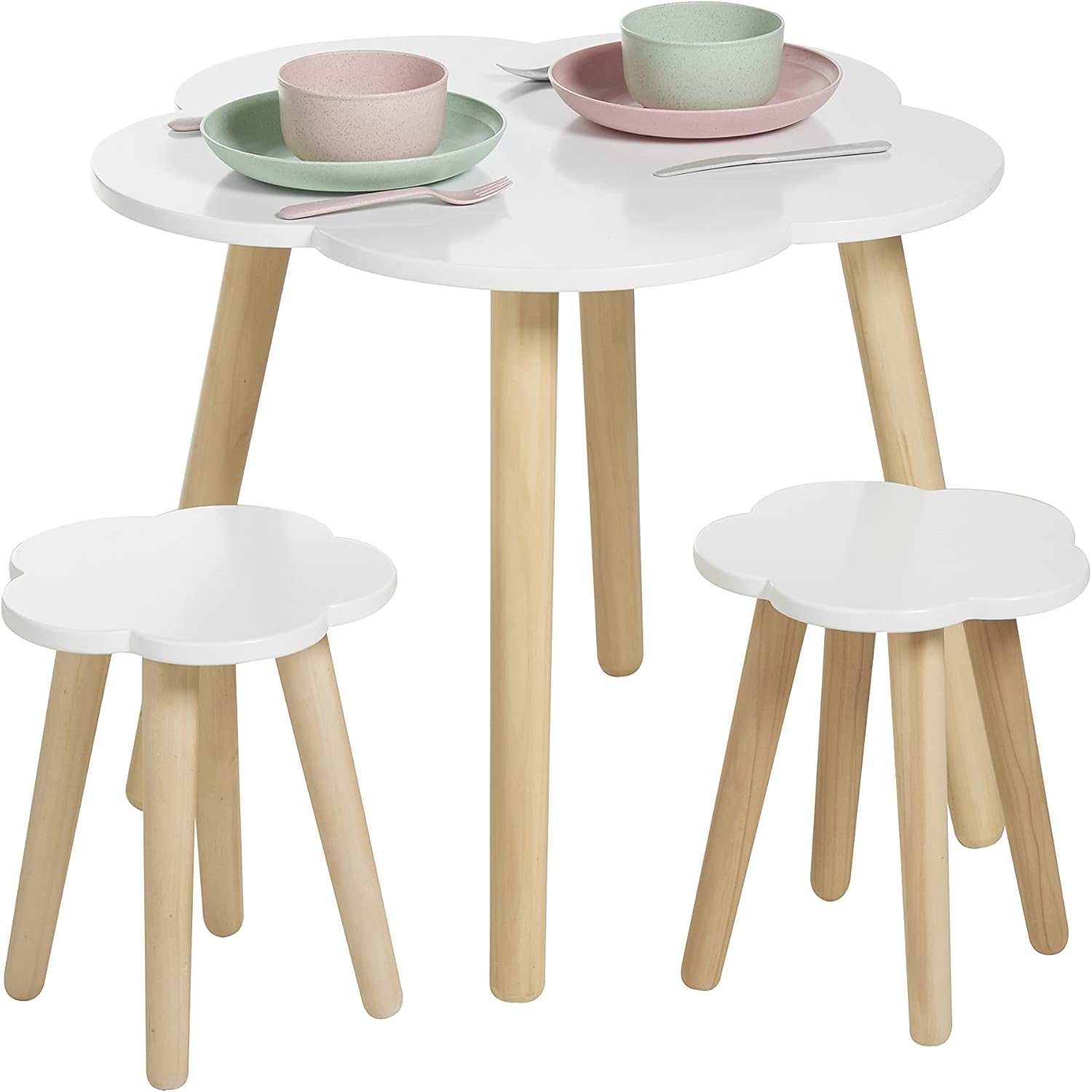 L’ensemble comprend une table nuage blanche et deux tabourets nuage avec pieds en bois massif naturel. Cette conception originale en forme de nuage stimulera l’imagination de votre enfant, tout en lui offrant un espace sûr et confortable pour explorer sa créativité. La table mesure 60 cm de longueur, 60 cm de largeur et 50 cm de hauteur. Chaque tabouret mesure quant à lui 25 cm de longueur, 25 cm de largeur et 30 cm de hauteur.