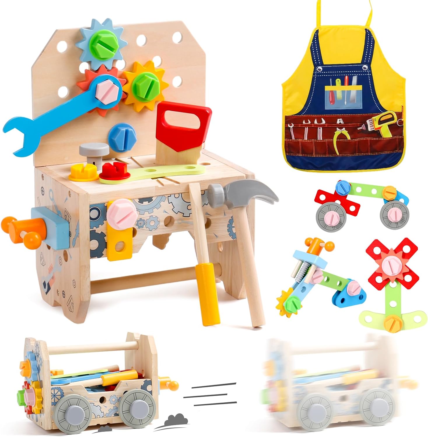 L’établi Montessori est livré avec un ensemble complet de 52 pièces comprenant un tournevis, un marteau, une scie à bois, une clé et bien d’autres accessoires attrayants. Tous ces éléments sont fabriqués en plastique et en bois résistants pour garantir une utilisation durable. De plus, un magnifique tablier à motifs est inclus pour rendre les jeux de rôle plus amusants.