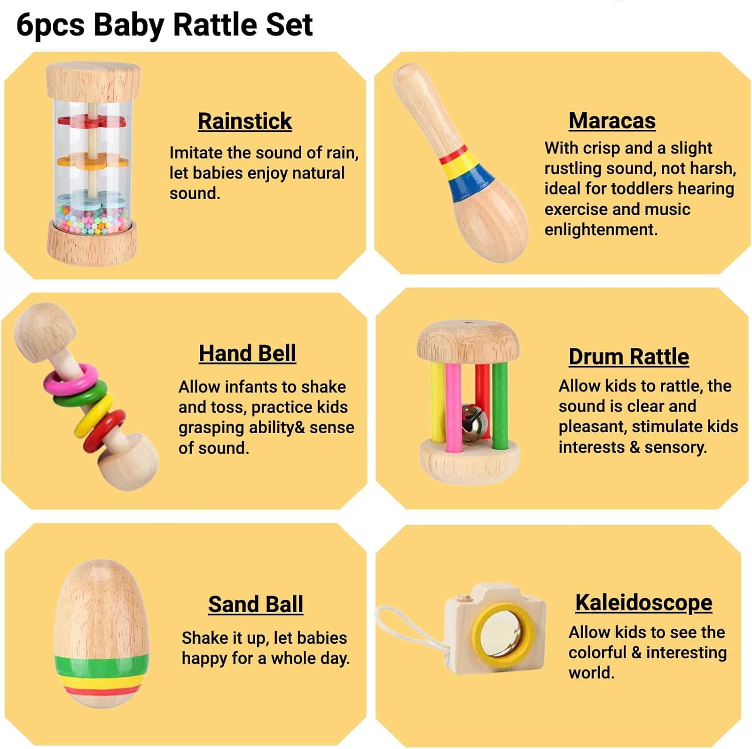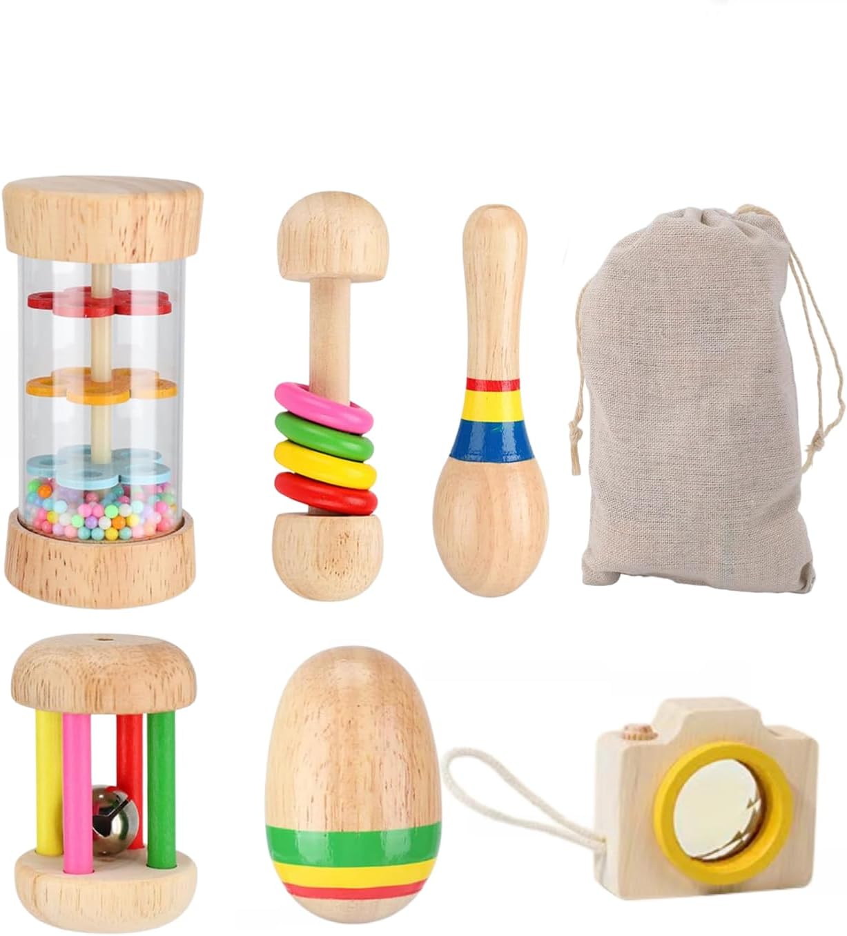 Ces six jouets constituant notre ensemble permettent aux bébés d’expérimenter diverses sensations : secouer, saisir, mâcher, lancer… Chaque objet invite à la découverte d’un univers sonore différent, stimulant ainsi les intérêts et les sens des enfants.