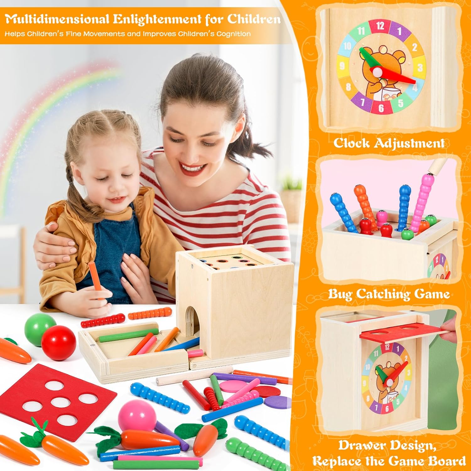 Le jeu de motricité Montessori propose six activités différentes pour stimuler l’intérêt et la curiosité de votre enfant : un jeu de chute de balle, un jeu de correspondance des couleurs, un jeu de tri de carottes, un jeu d’attrape-insectes, un jeu de chute de pièces et un réglage de l’horloge. Ces activités variées permettent aux enfants d’améliorer leur motricité fine et leurs capacités sensorielles tout en s’amusant.