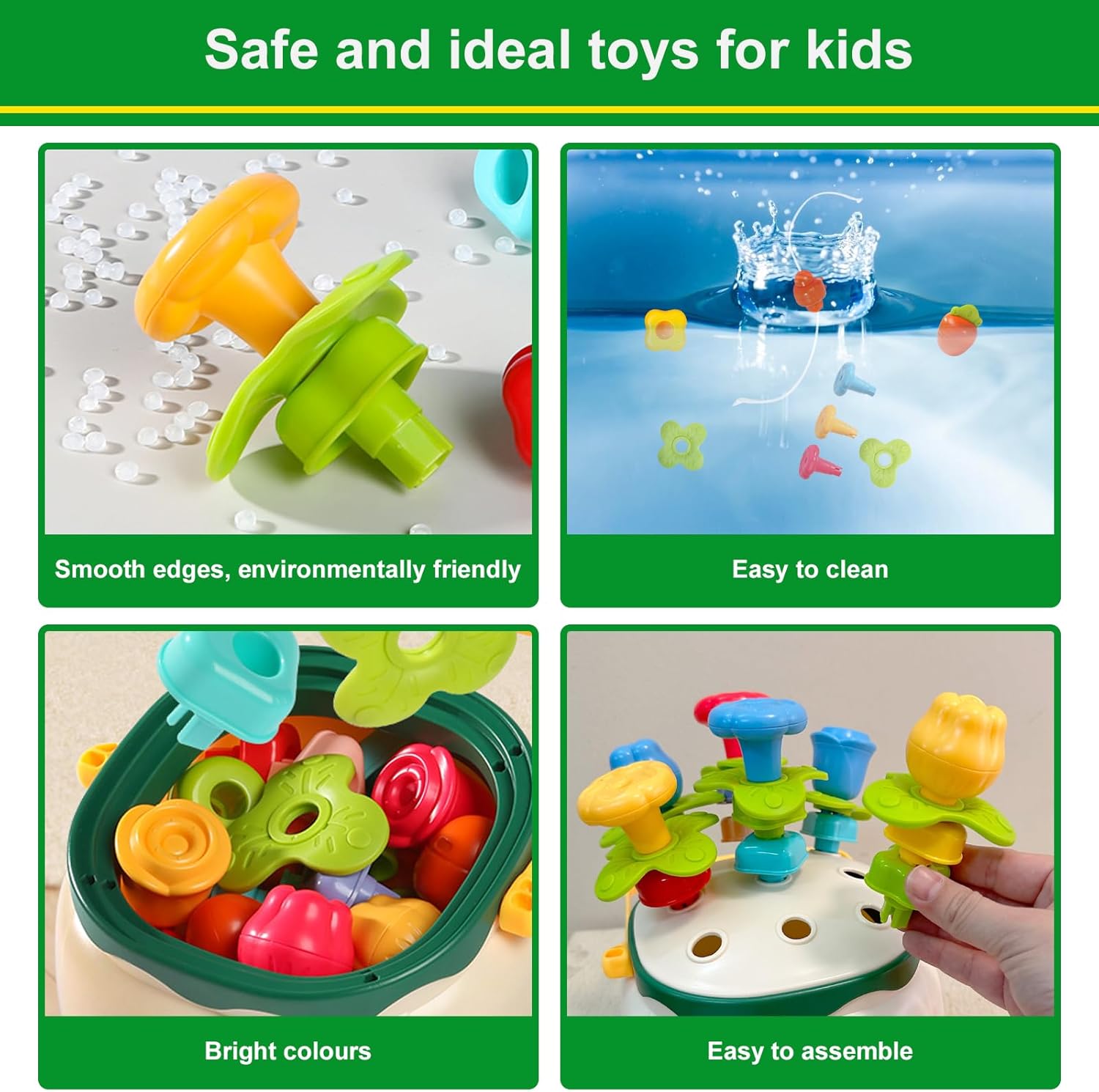 Ce jouet est conçu pour répondre aux besoins de développement des jeunes enfants. En manipulant les différentes pièces du jeu, votre enfant améliore sa motricité fine, sa coordination œil-main et sa concentration. De plus, l’assemblage des fleurs stimule la réflexion logique et la résolution de problèmes, tout en éveillant leur curiosité naturelle. Ce jouet est une excellente manière d’apprendre en jouant, tout en offrant une expérience sensorielle captivante grâce aux couleurs vives et aux textures variées.