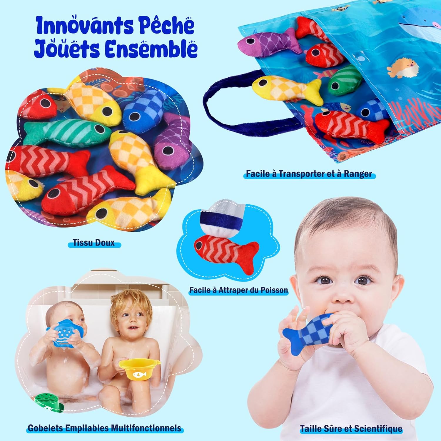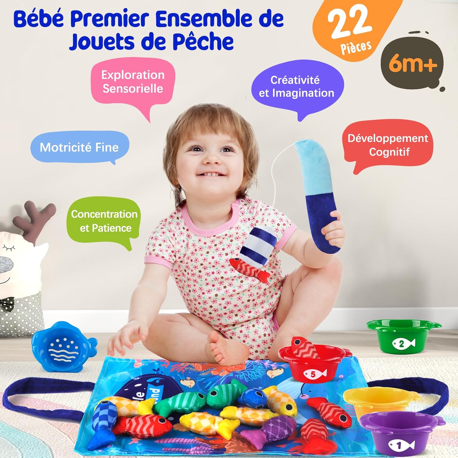 - Contenu : 22 pièces, incluant une canne à pêche, 15 poissons, 5 gobelets empilables, un tapis océan et un sac de rangement.