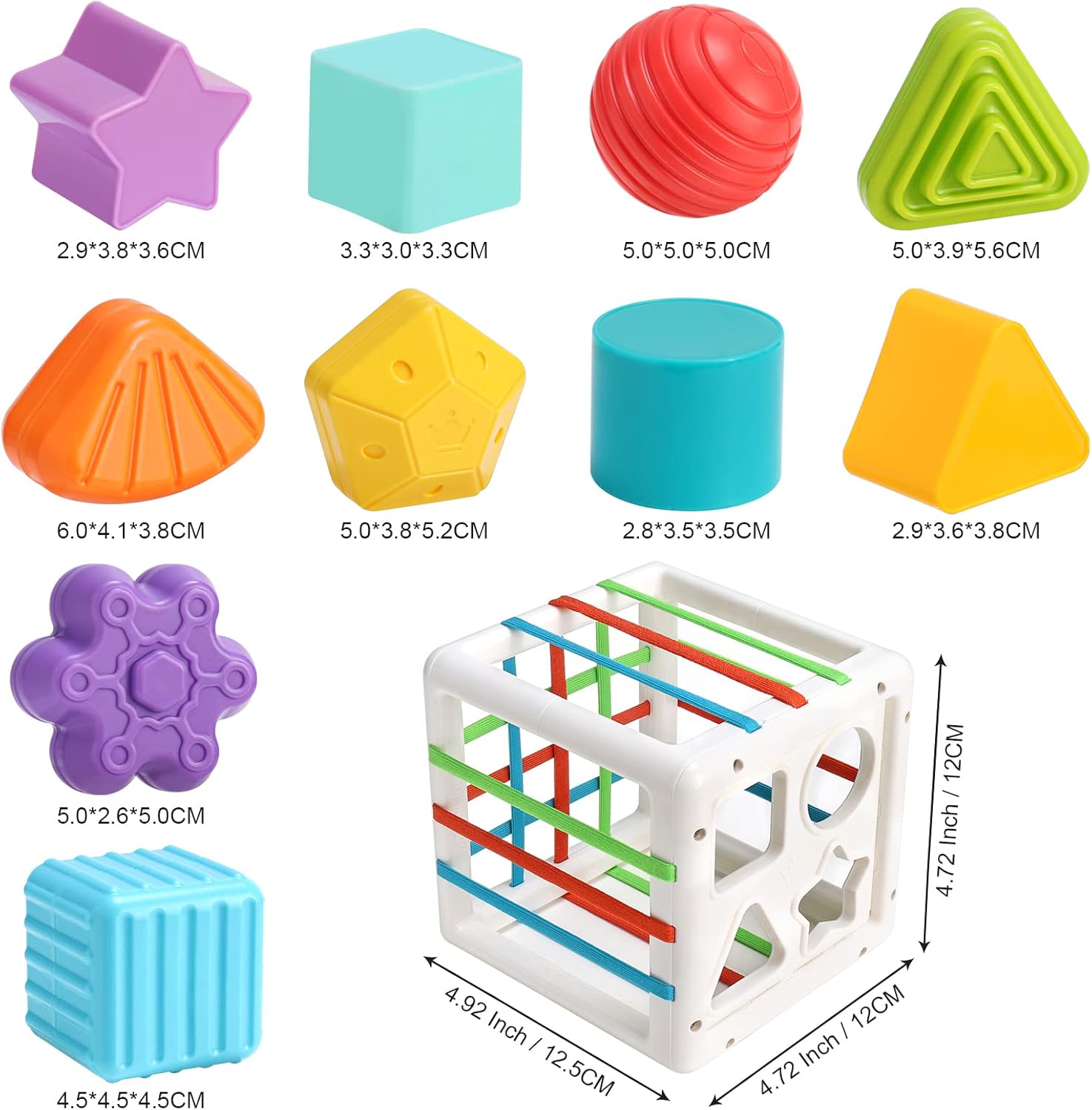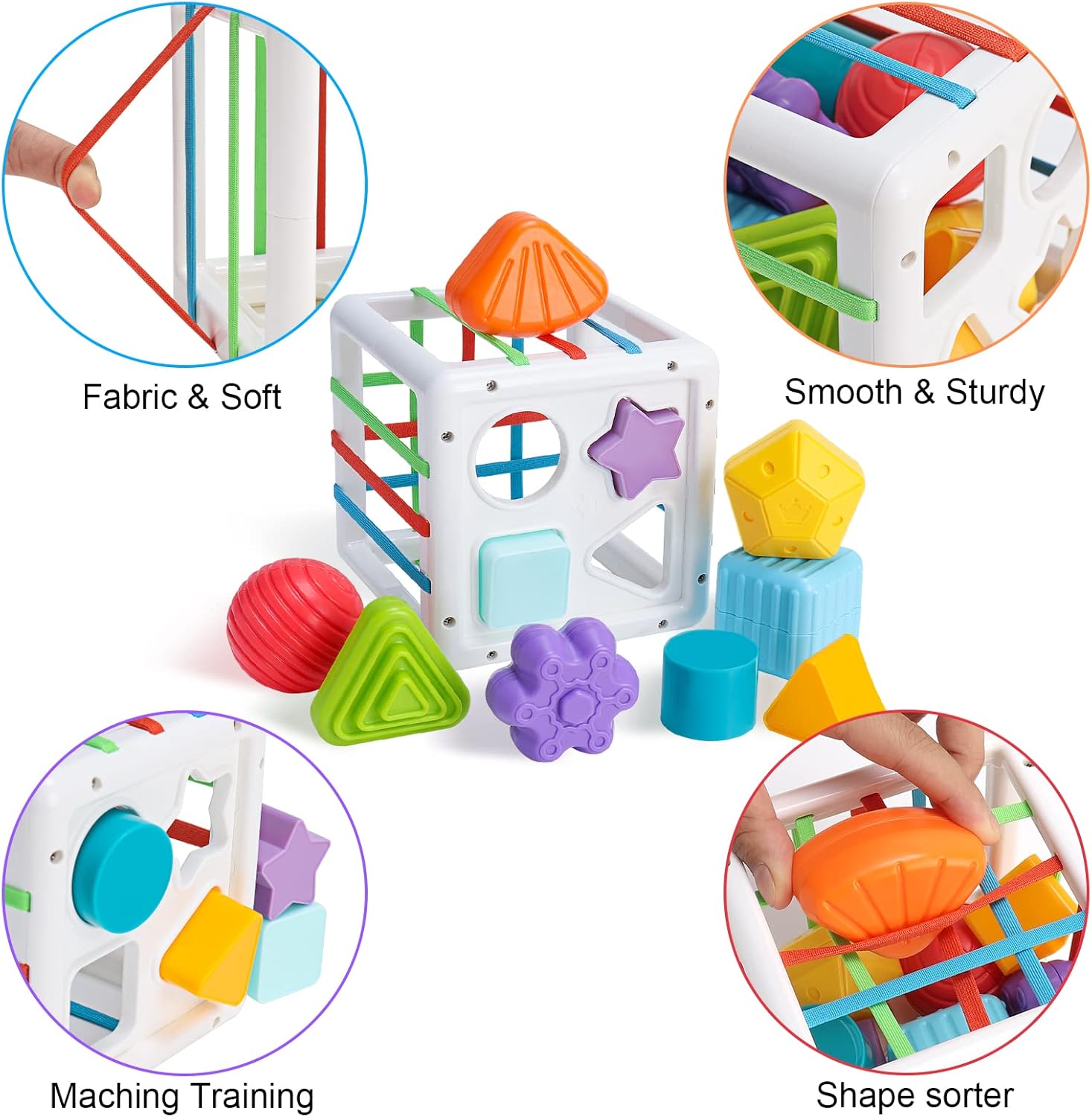 Le jouet de tri sensoriel Wodasi est un ensemble harmonieux comprenant une boîte sensorielle agrémentée de bandes élastiques colorées, 4 trieurs de formes distincts et 6 blocs de construction texturés. Ces éléments, faciles à saisir, sont conçus avec des textures variées et des couleurs vives.