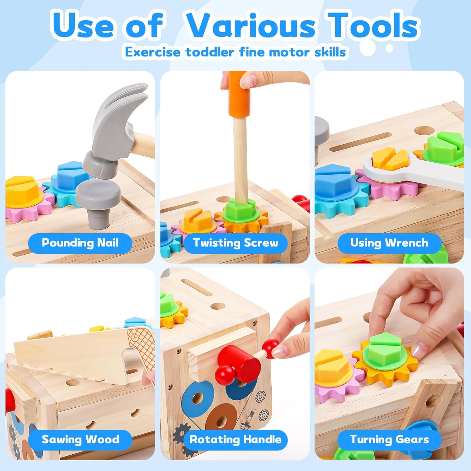 Fabriqué principalement en bois, ce jouet d’éveil Montessori est non seulement robuste mais aussi totalement sûr pour votre enfant. Sa surface très lisse et sans bavures garantit que la peau délicate de votre enfant ne sera pas blessée pendant le jeu. De plus, les vis et les écrous sont spécialement fabriqués en plastique, plus facile à serrer et plus durable que le bois. La peinture à base d’eau assure que les accessoires ne perdent pas facilement leur couleur.