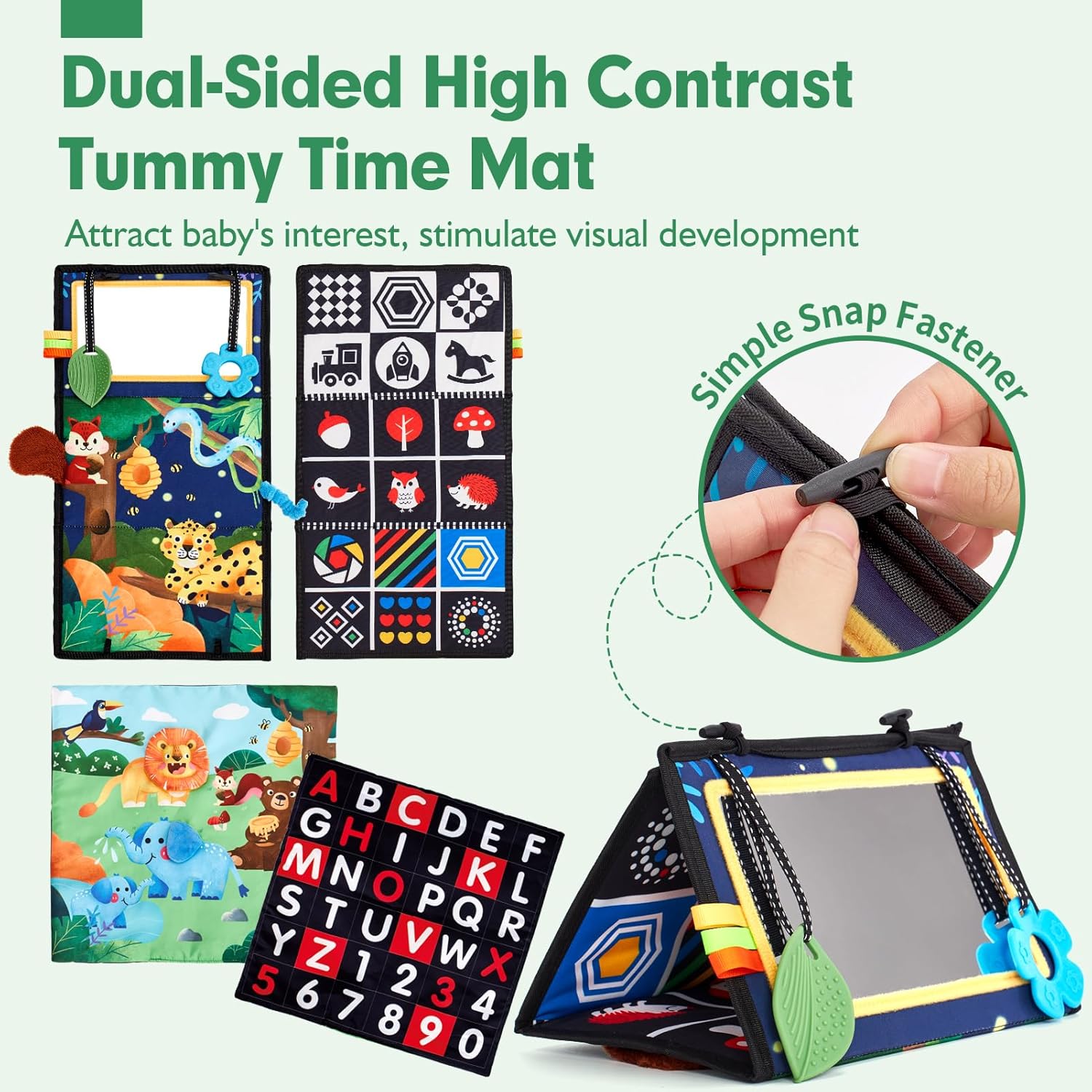 Chaque élément du jouet d’éveil, y compris le miroir de jeu sur le ventre et le calendrier pliable, propose une face noir et blanc à fort contraste, ainsi qu’une face colorée vibrante. Les queues d’animaux texturées en 3D stimulent le développement visuel et sensoriel de votre bébé. Utilisés ensemble ou séparément, ces jouets attrayants divertiront certainement votre bébé pendant son temps d’éveil !