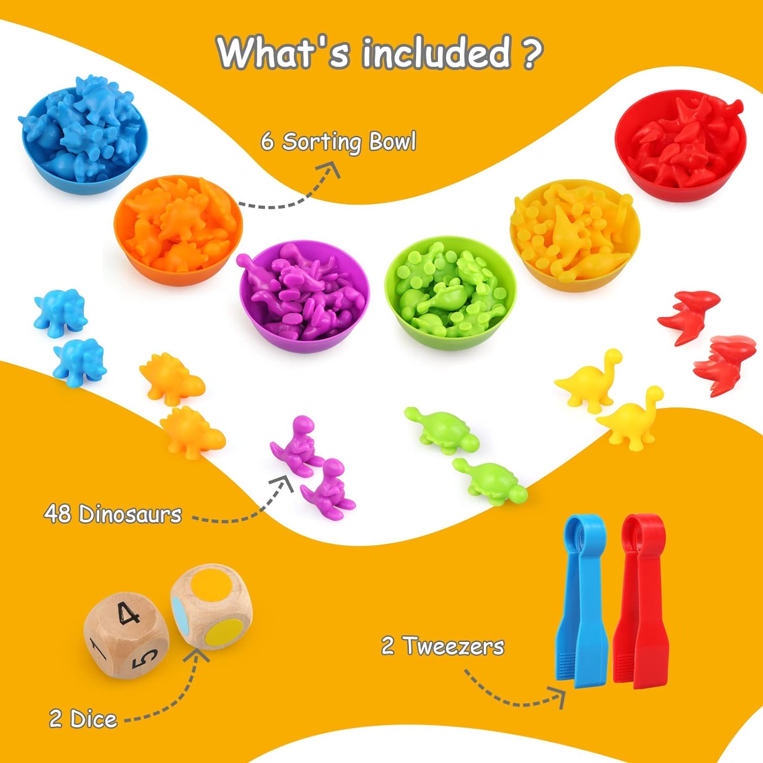 Cet ensemble éducatif comprend 58 pièces, conçues pour favoriser la créativité et l’apprentissage chez les enfants. Parmi elles, vous trouverez 48 dinosaures colorés, six bols, deux clips, deux dés et un gobelet de rangement en plastique. Chaque dinosaure et chaque bol se décline en six couleurs différentes : rouge, orange, jaune, vert, bleu et mauve. Cette diversité de couleurs et de formes contribue à enrichir l’expérience de jeu et à renforcer l’apprentissage visuel des enfants.