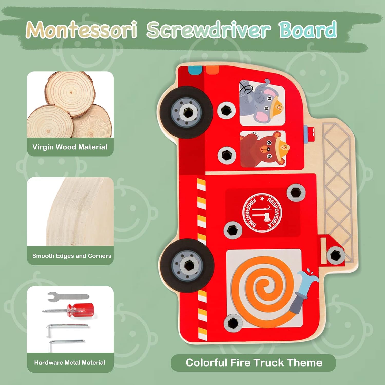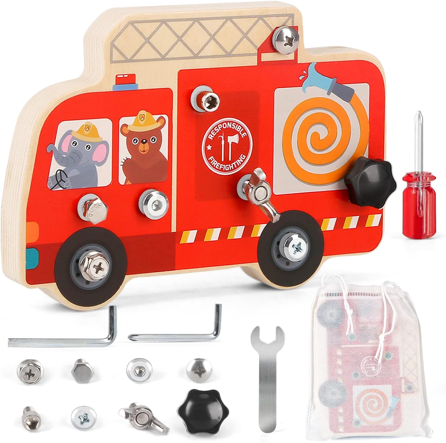 L’ensemble comprend une planche d’occupation sur le thème du camion de pompiers, quatre outils pour visser et huit types de boulons. Votre enfant apprendra à manier tournevis et autres outils durant ses heures de jeu, acquérant ainsi des compétences pratiques essentielles à son développement.