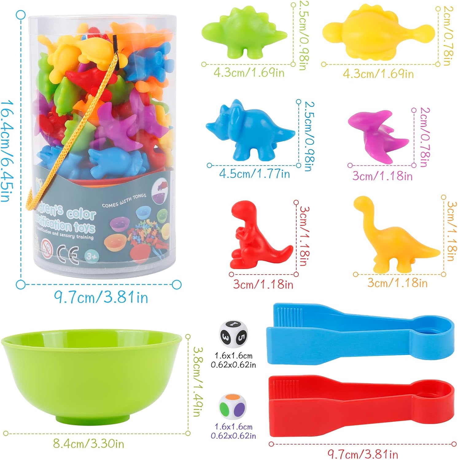 L’ensemble du jeu comprend 48 adorables dinosaures de six couleurs vives qui captiveront l’attention de votre enfant. Les deux pinces jumbo incluses stimuleront la coordination œil-main de votre petit tandis que les six gobelets de triage colorés faciliteront la reconnaissance des couleurs. Le gobelet de rangement transparent permettra un rangement facile et rapide après chaque session de jeu.