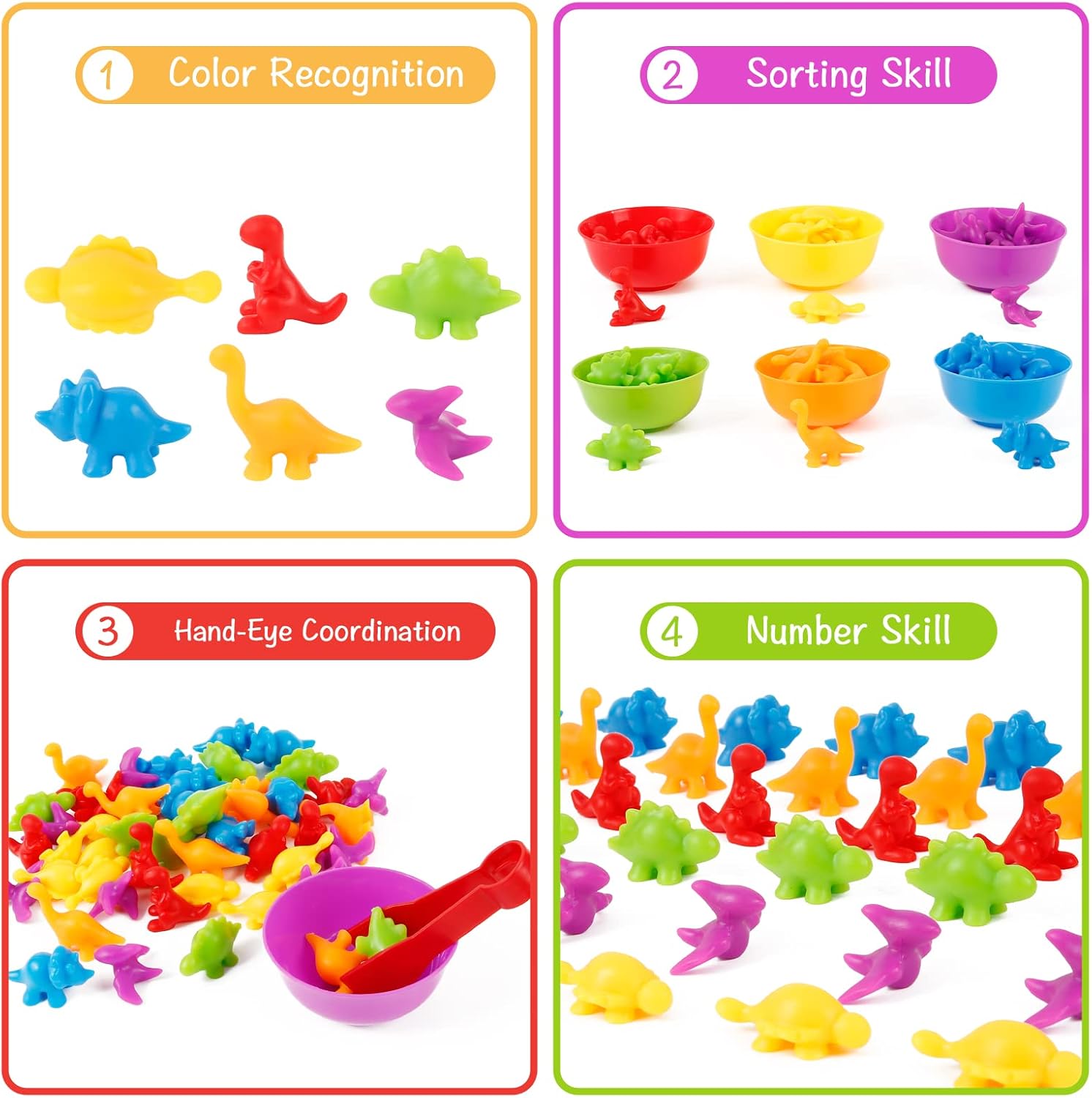 Les différentes couleurs des dinosaures à compter servent à améliorer la capacité de reconnaissance des couleurs, tout en développant les compétences mathématiques de votre enfant. Ce jeu stimule l’apprentissage des concepts tels que l’addition, la soustraction, la multiplication et la division.