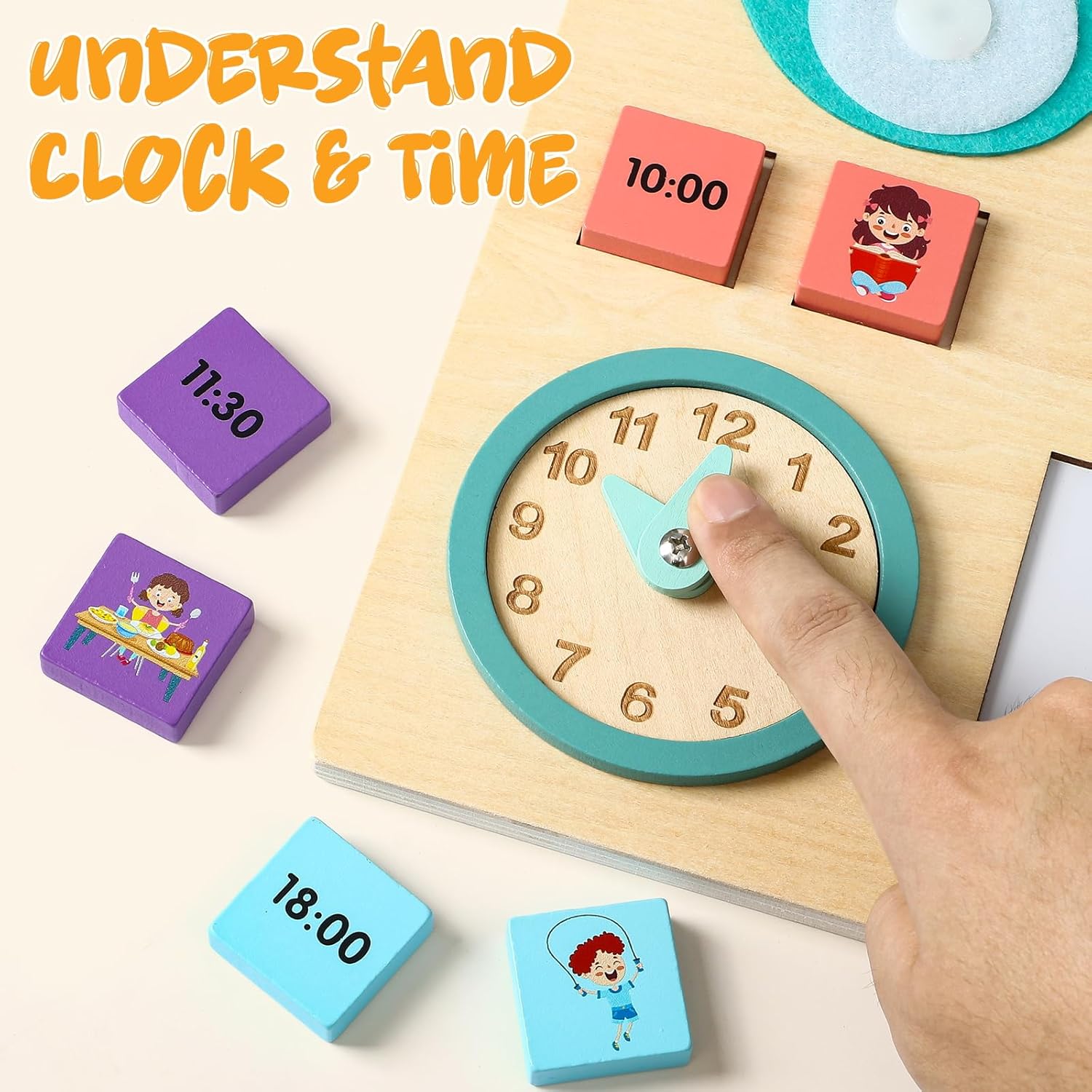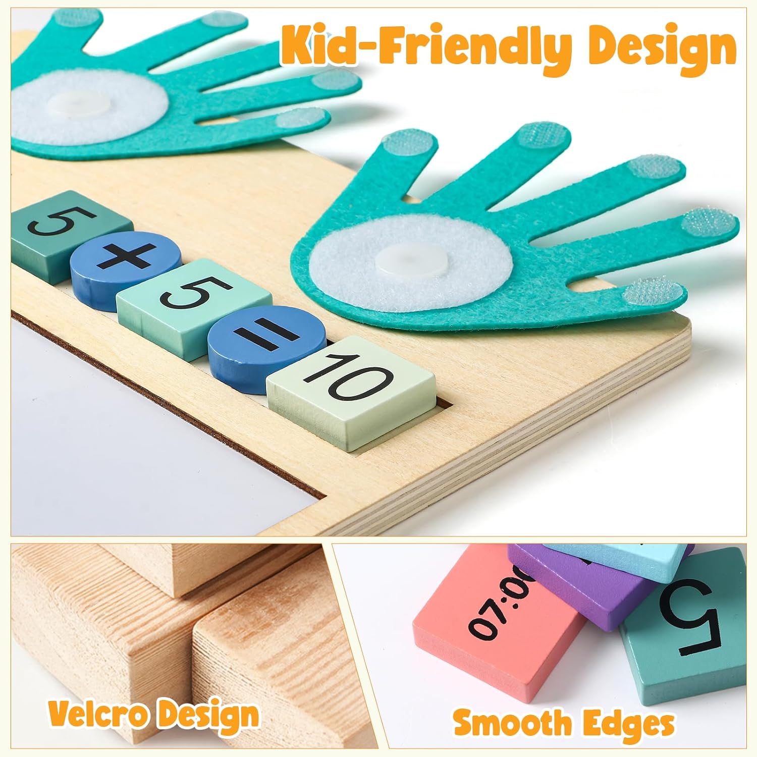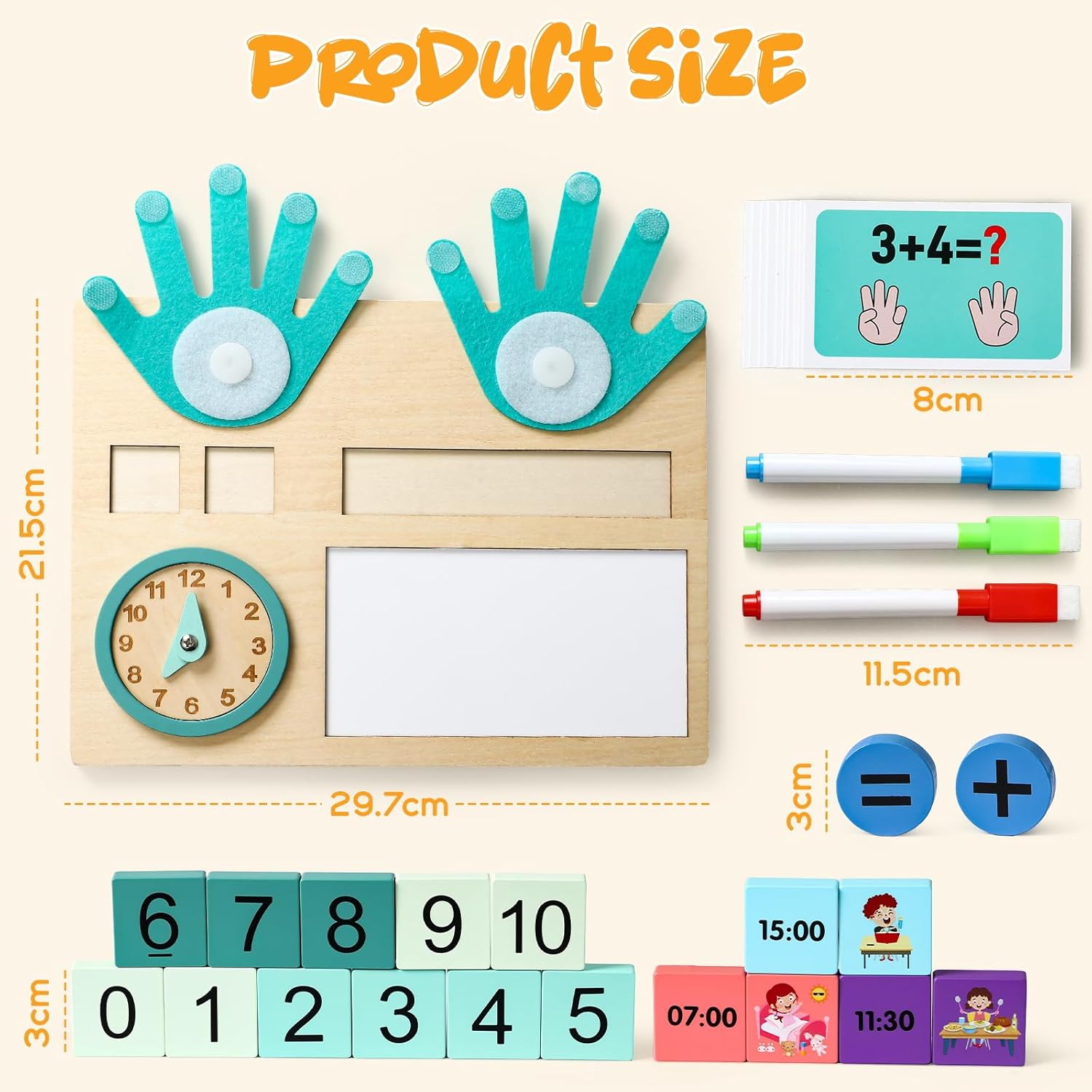 - Contenu inclus : une planche en bois, deux mains en feutrine, une horloge mobile, 11 blocs numérotés, 3 blocs horaires, 3 blocs d’activités et des cartes d’exercices d’addition/soustraction.
