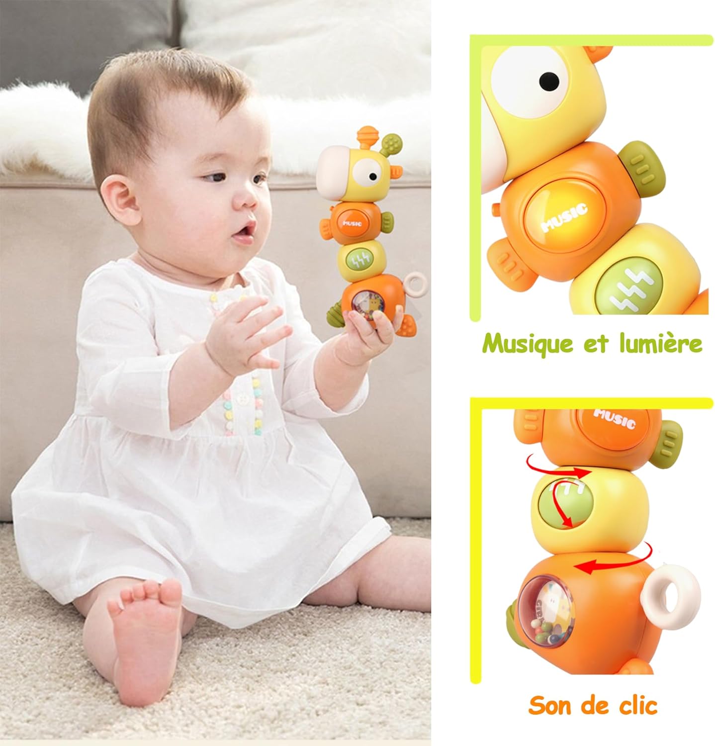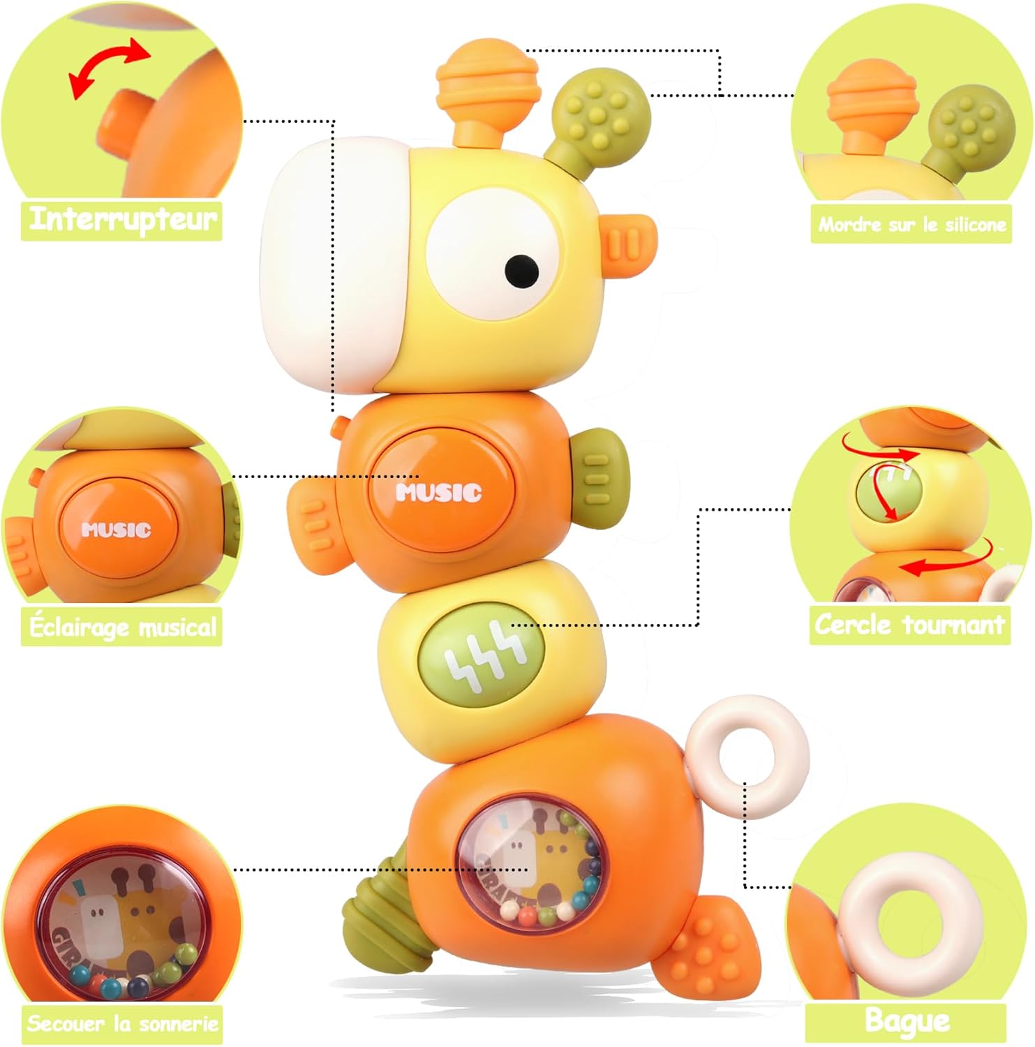 Ce jouet Montessori offre une multitude d’expériences sensorielles à votre bébé. Il peut être saisi, secoué, mordillé et tourné, chaque action déclenchant une réaction différente pour le plus grand plaisir des tout-petits. Sous la forme colorée et amusante d’une girafe, ce jouet émet une lumière douce et propose divers sons musicaux qui captivent l’attention des bébés.