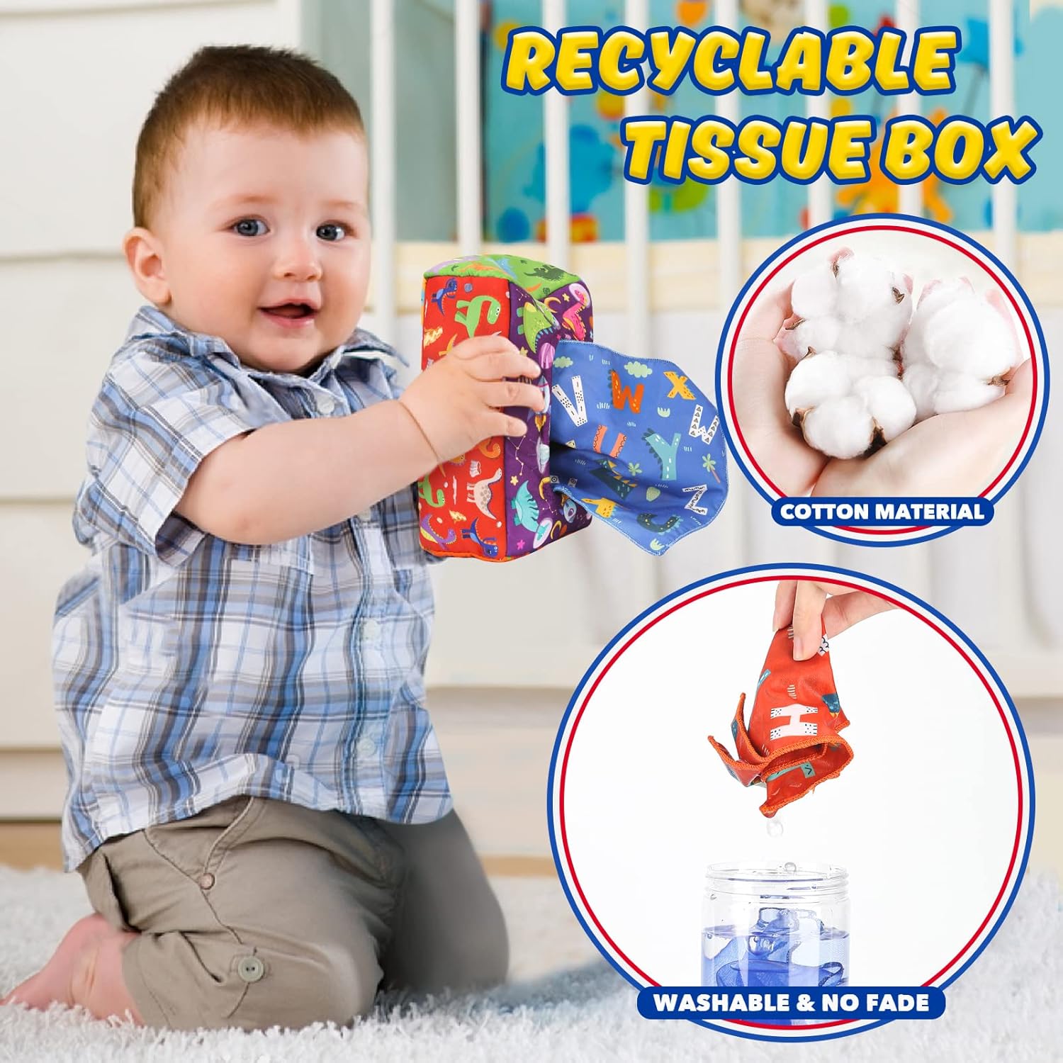 Nous savons que la plupart des bébés aiment jouer avec des boîtes de mouchoirs en papier. C’est pourquoi nous avons créé cette alternative sûre et amusante qui permettra à votre bébé de profiter d’heures d’amusement tout en stimulant ses sens.