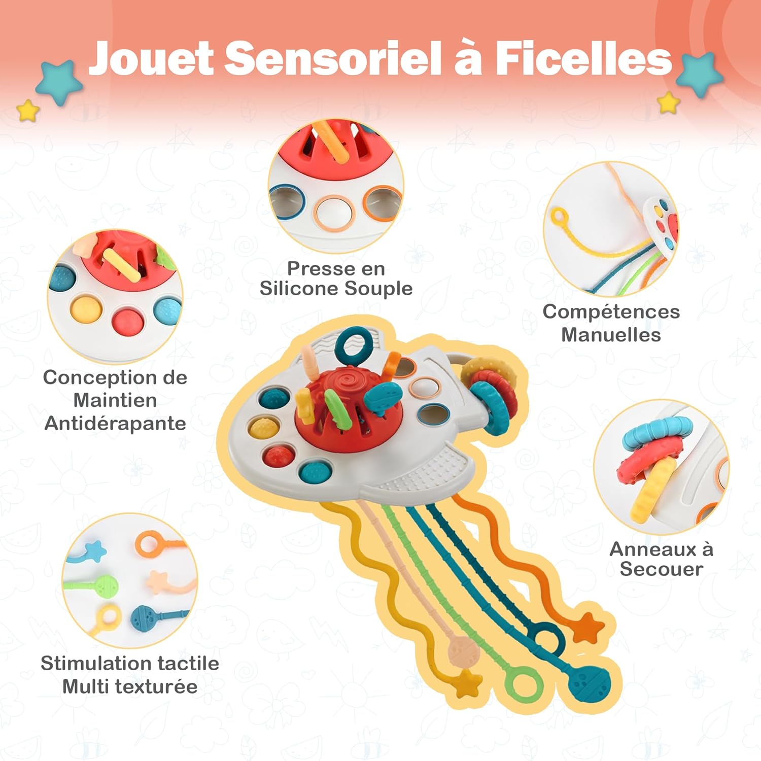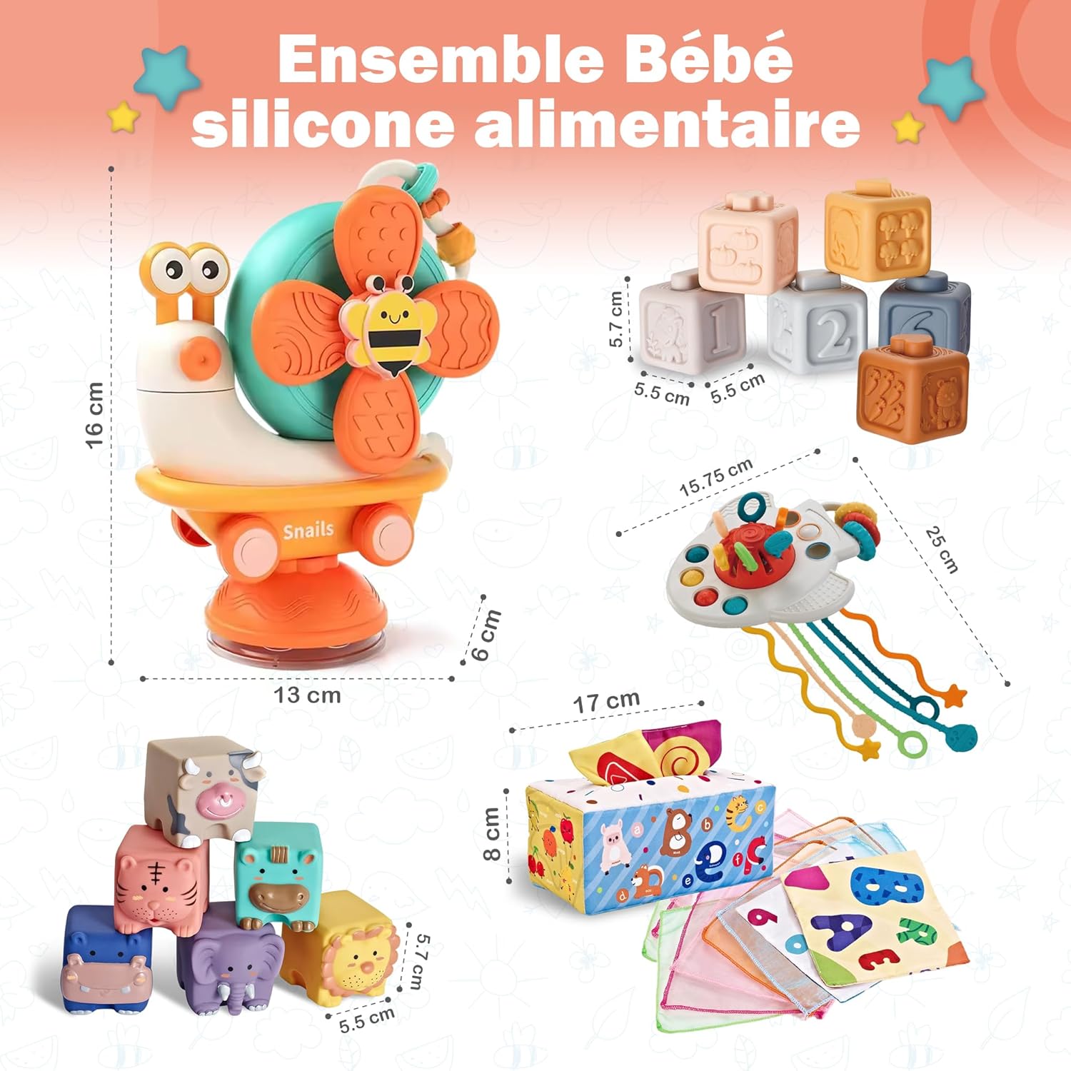 Ce jouet Montessori regorge d’activités conçues pour éveiller les sens de votre bébé. Entre la boîte à mouchoirs en tissu ornée de lettres de l’alphabet et d’animaux colorés, et la fusée sensorielle équipée de cordes en silicone, chaque élément favorise la préhension et la coordination. La balle à boutons ainsi que les billes poppers à bulles sont idéales pour renforcer la dextérité tout en procurant des moments de jeu captivants.