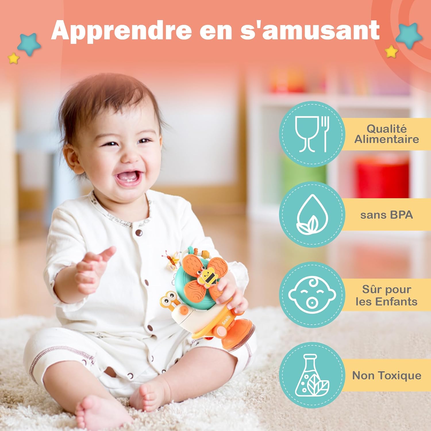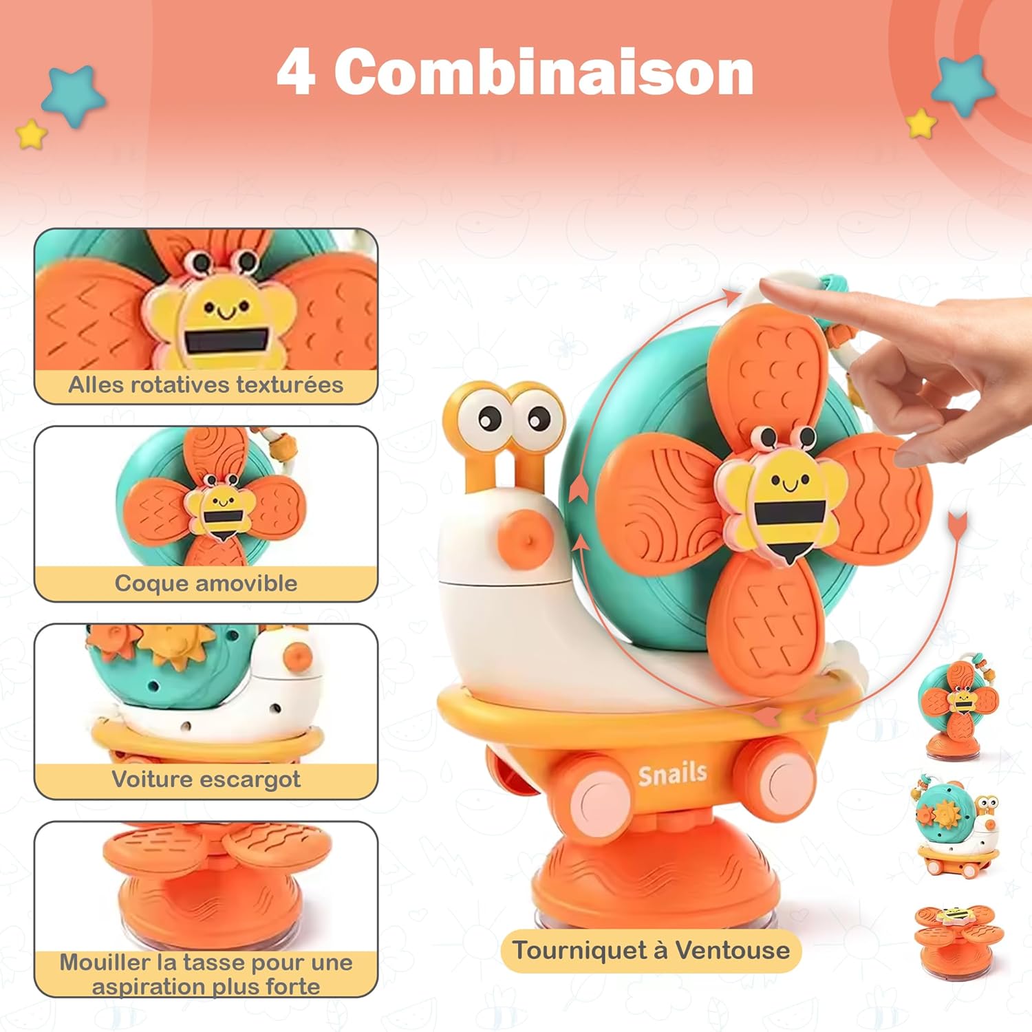 - Simplicité d’utilisation : L’escargot à ventouse permet un jeu stable sur une chaise haute ou toute autre surface plane.