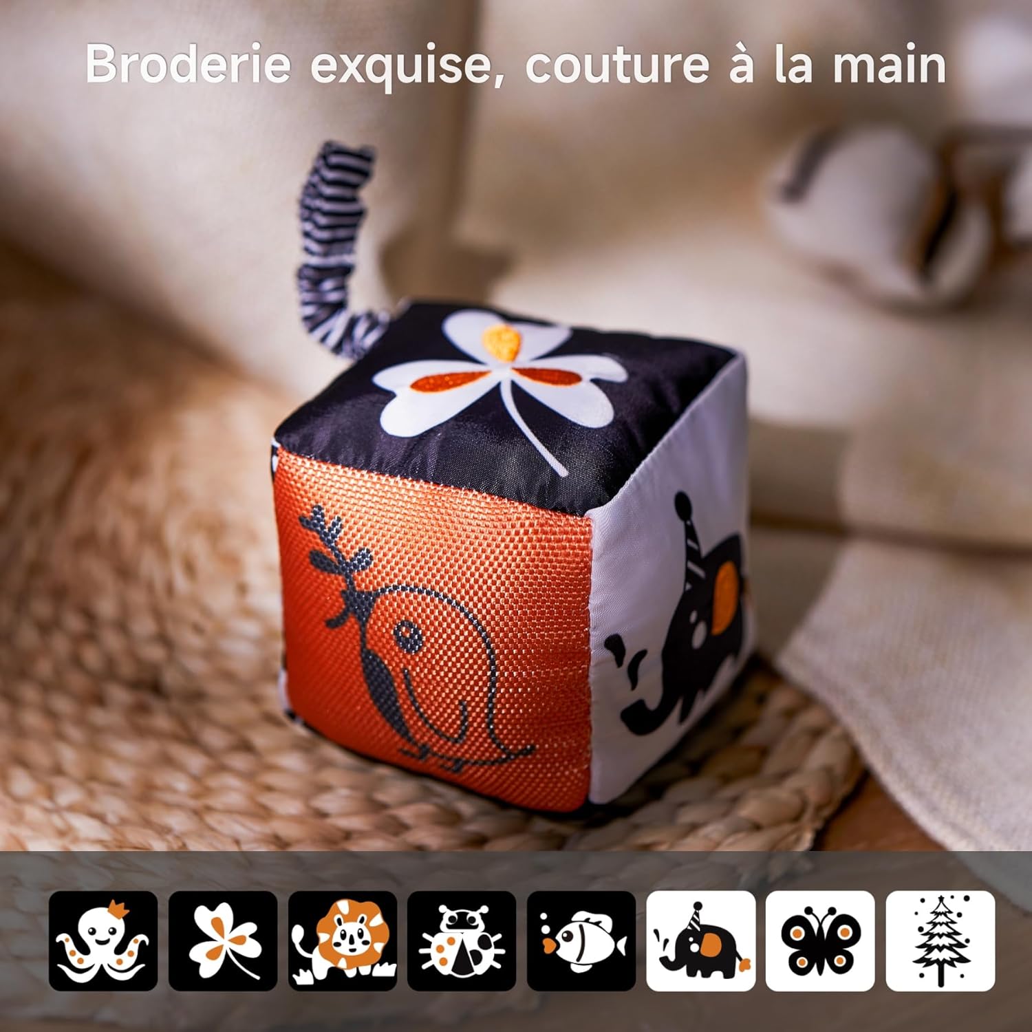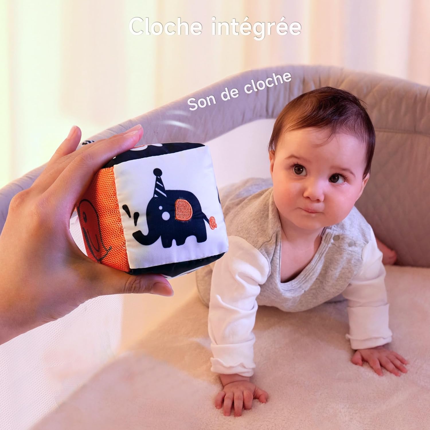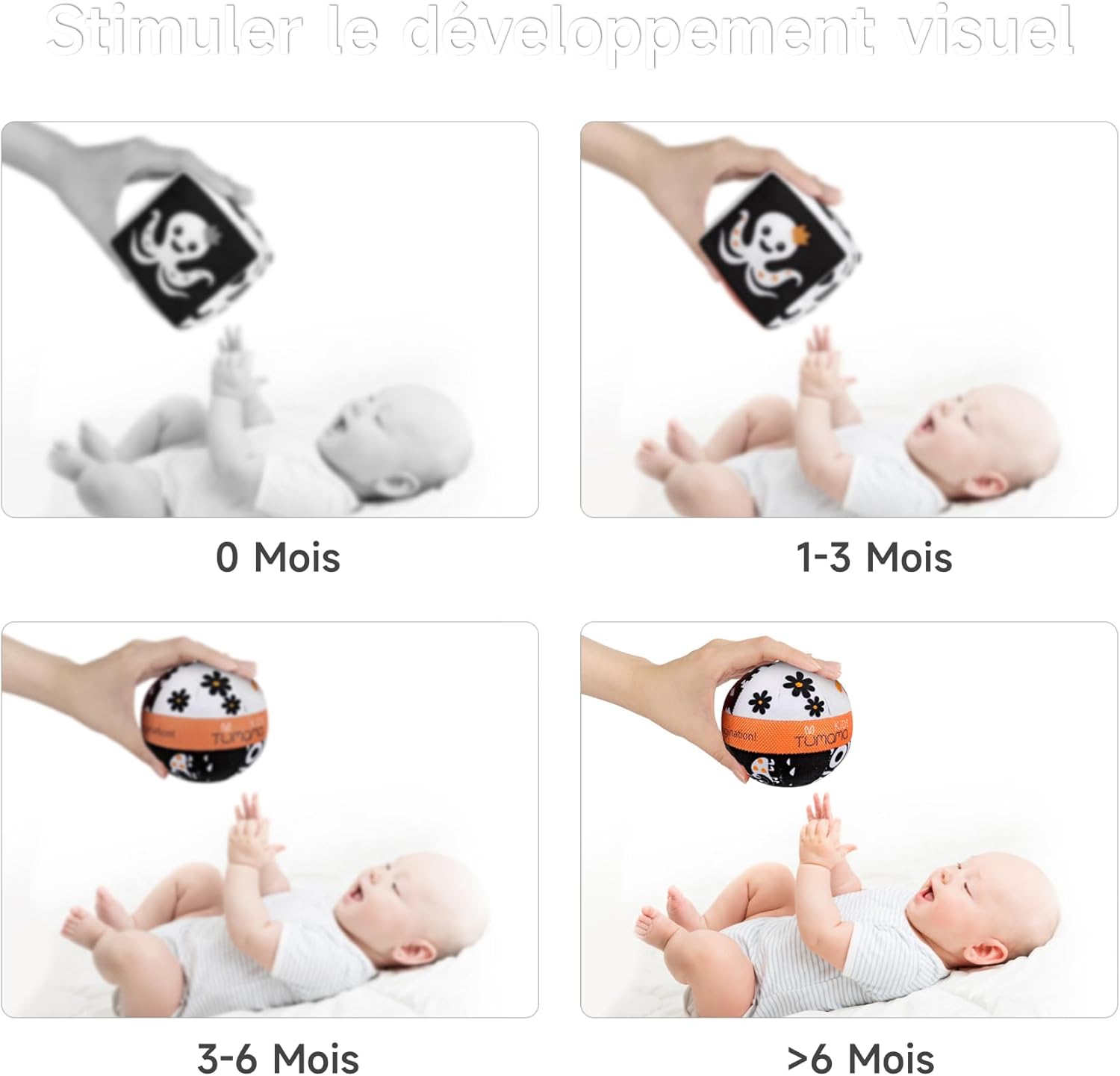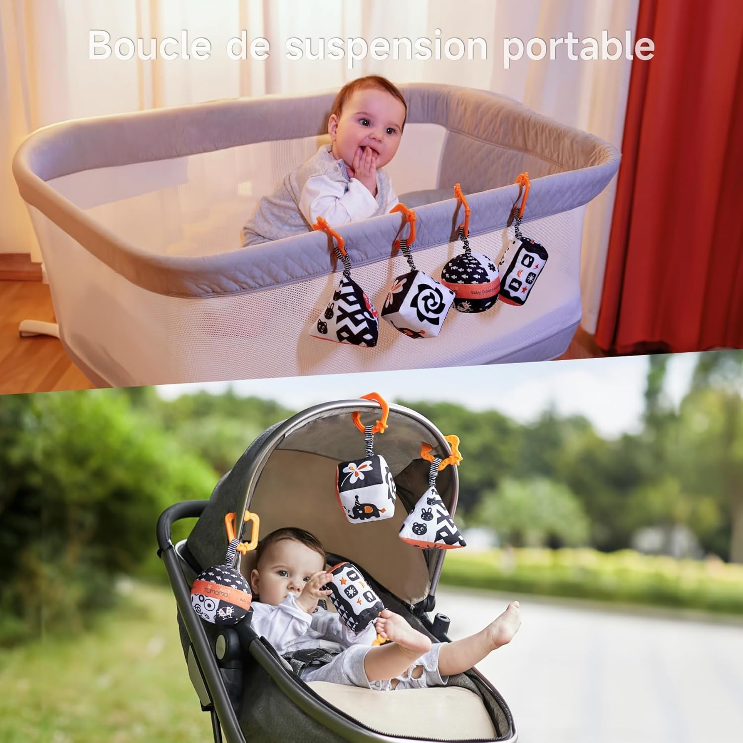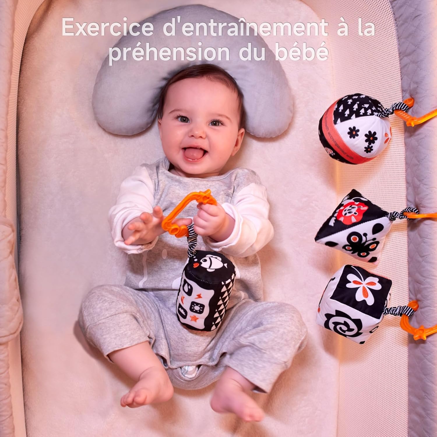 - Couleurs contrastées : Noir et blanc pour stimuler le développement visuel.