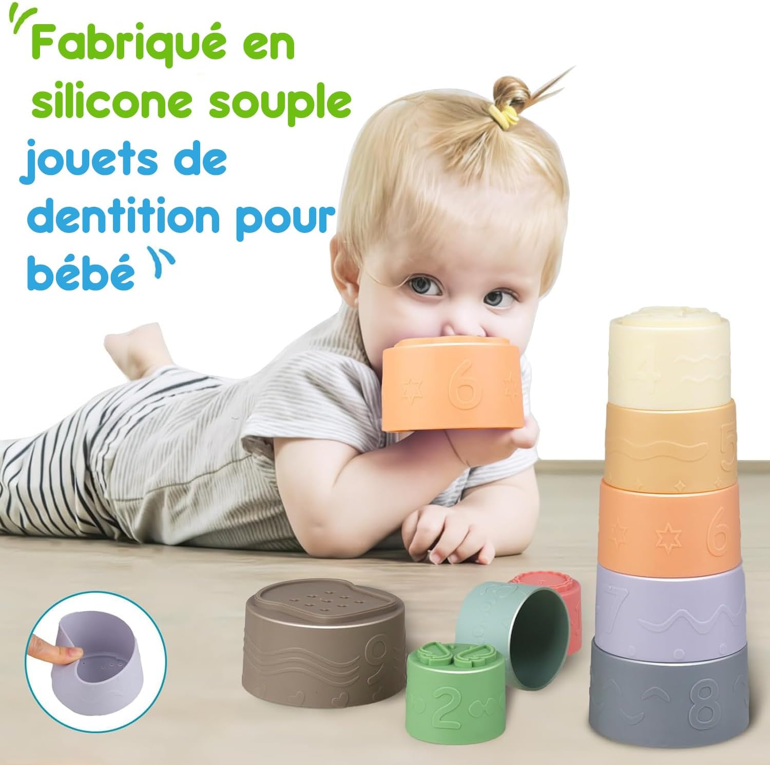 Ces gobelets ne sont pas seulement destinés à l’empilage. Leur utilisation est aussi variée que l’imagination de votre enfant ! Ils peuvent servir de jouets de dentition apaisants, d’accessoires amusants pour le bain ou même être emportés à la plage pour construire des châteaux de sable. Une multitude d’activités interactives attendent votre petit explorateur.